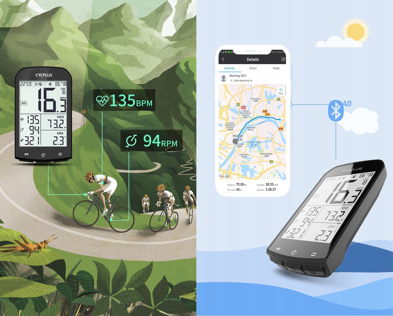 Удобный и чрезвычайно прочный велокомпьютер CYCPLUS M1 GPS — необходимое оборудование для всех, кто увлекается велоспортом – как профессионально, так и любительски. Одно устройство позволит вам отслеживать статистику вождения, записывать маршрут вождения и (после подключения периферийных устройств) отслеживать частоту сердечных сокращений, частоту вращения педалей и мощность. Все это благодаря встроенным модулям GPS, Bluetooth и ANT+.