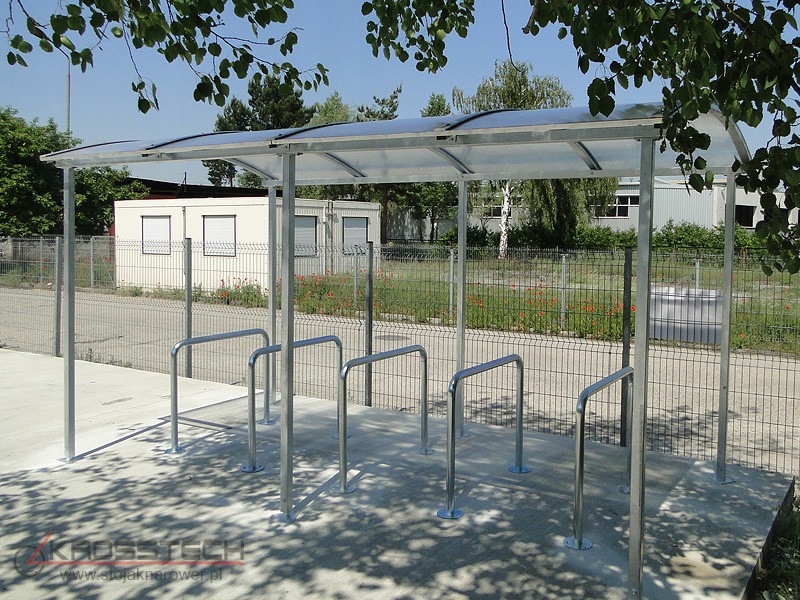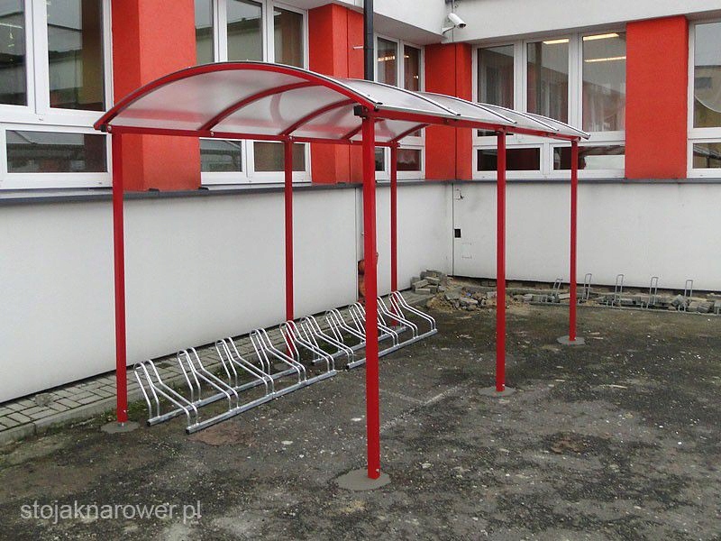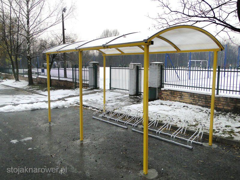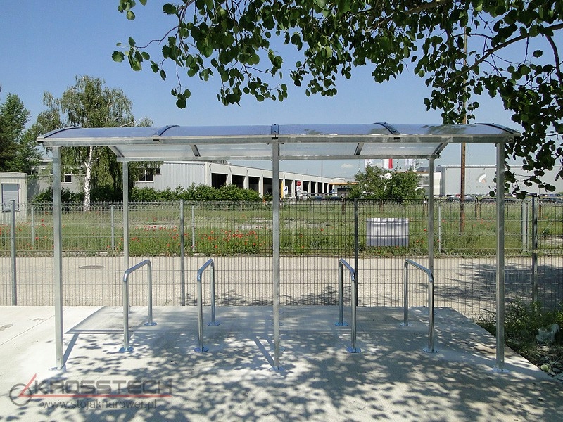 Велопарковка «Зорза» на 10 велосипедов. Главным преимуществом навеса является возможность установки дополнительных модулей крыши, что обеспечивает защиту большего количества велосипедов. Он полностью совместим с нашими стендами (RAD, CROSS, ECHO PION, модели U-типа), доступными на наших аукционах Allegro. Имеем полную проектную документацию на укрытие, включая документацию по нагрузке и прочности.