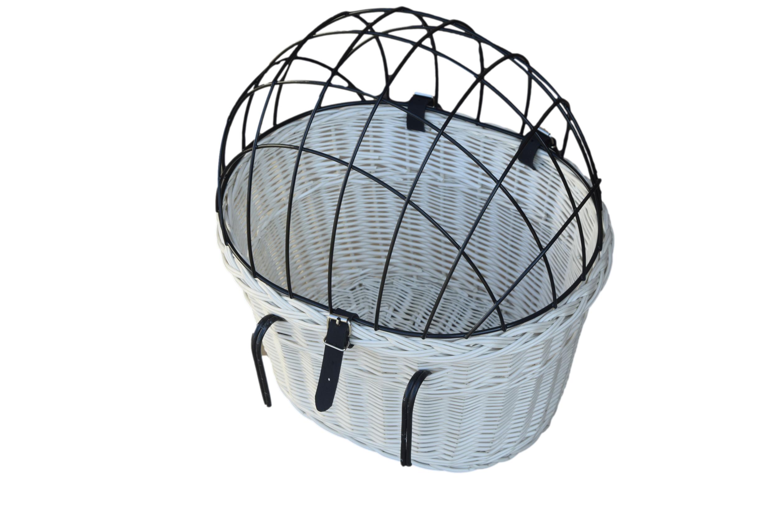 Плетеная велосипедная корзина БЕЛАЯ с металлическим замком (не крашеная - белая с нежным кремовым оттенком) - Идеальная корзина для перевозки собаки или кошки. Корзина крепится на руль с помощью специально изогнутых крючков, покрытых специальным материалом, чтобы не поцарапать руль. Крючки можно вручную согнуть, чтобы они соответствовали рулю.