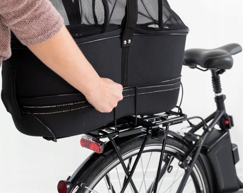 Корзина легко крепится к багажнику с помощью липучки. Кроме того, ручки позволяют использовать его в качестве ручной переноски. Сетчатая крышка обеспечивает безопасность и хороший поток воздуха. Встроенный короткий поводок используется для защиты питомца от выпрыгивания. Кроме того, используемые материалы гарантируют, что корзина для велосипеда сохранит свою форму, а ваш питомец будет чувствовать себя комфортно на съемной мягкой подкладке.