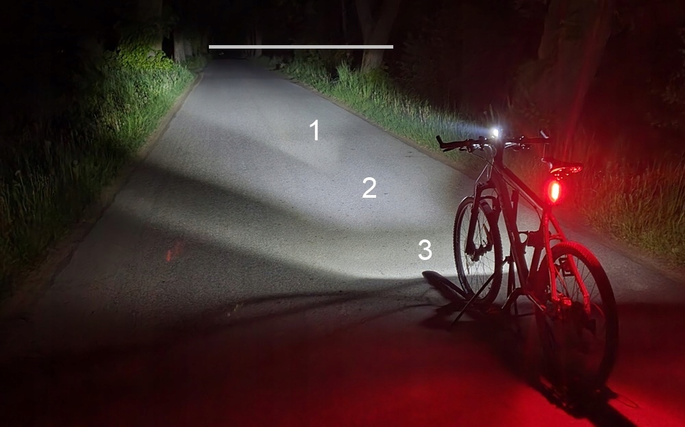 Свет в светильнике разделен на три фазы и четкую границу, как это видно на фото ниже. Лампа светит по схеме "три", свет явно сильнее на первой фазе и гаснет у руля.