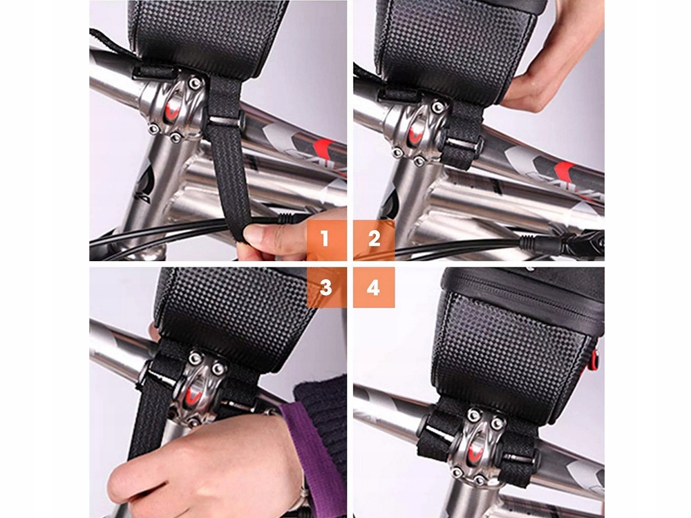 Сумка полностью жесткая и изготовлена из прочного материала. Крепится к раме велосипеда с помощью регулируемых застежек-липучек. Подходит для устройств с диагональю макс. 6,8 дюйма