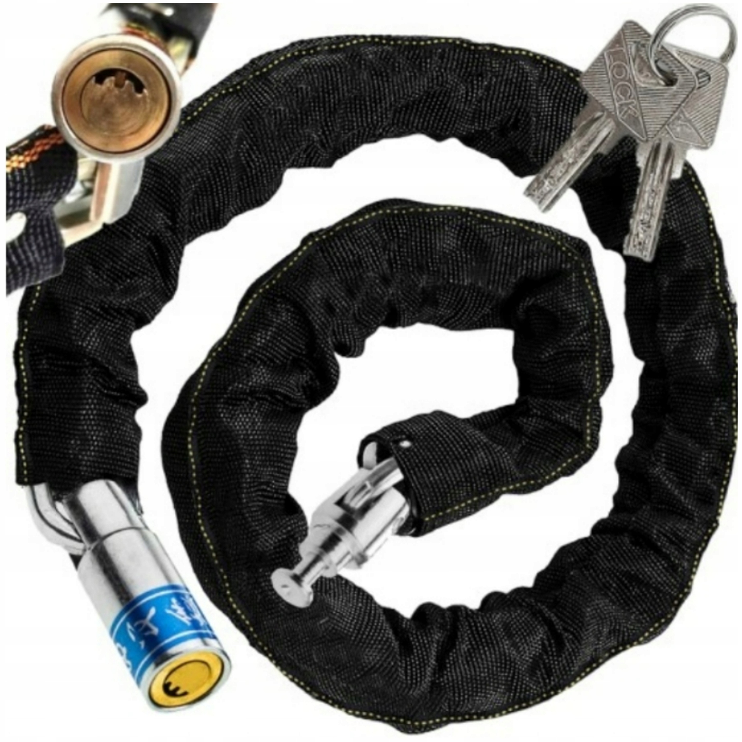 В комплект входят два ключа. Длина цепочки около 80см. Идеально подходит для закрытия решеток, ворот и т.п. Незаменим для закрепления различного рода вещей в местах с повышенным риском кражи.