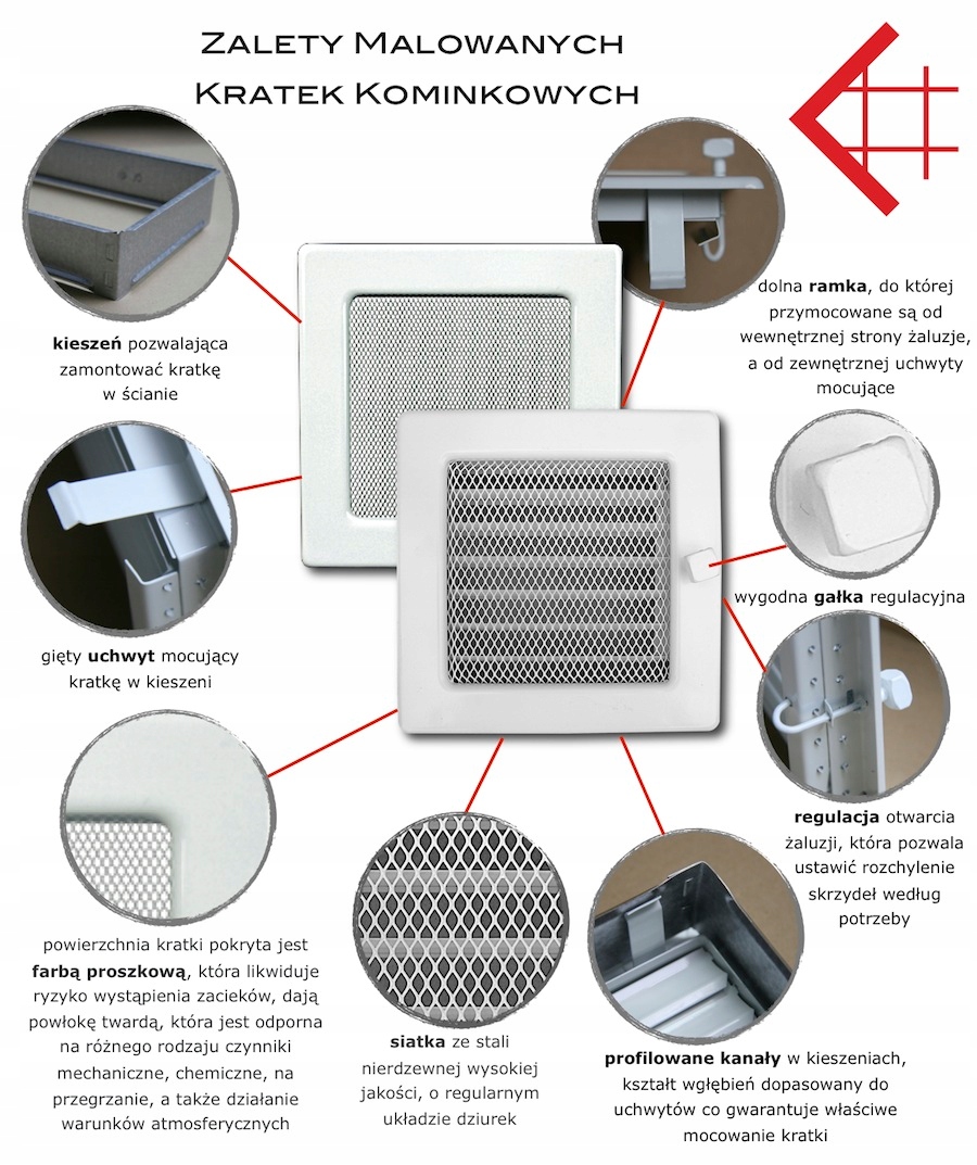 Решетки окрашены порошковым методом, который отличается стойкостью цвета и термостойкостью. Кроме того, краска защищает решетки от механических повреждений. Каждая решетка оснащена карманом, изготовленным из оцинкованного листового металла.