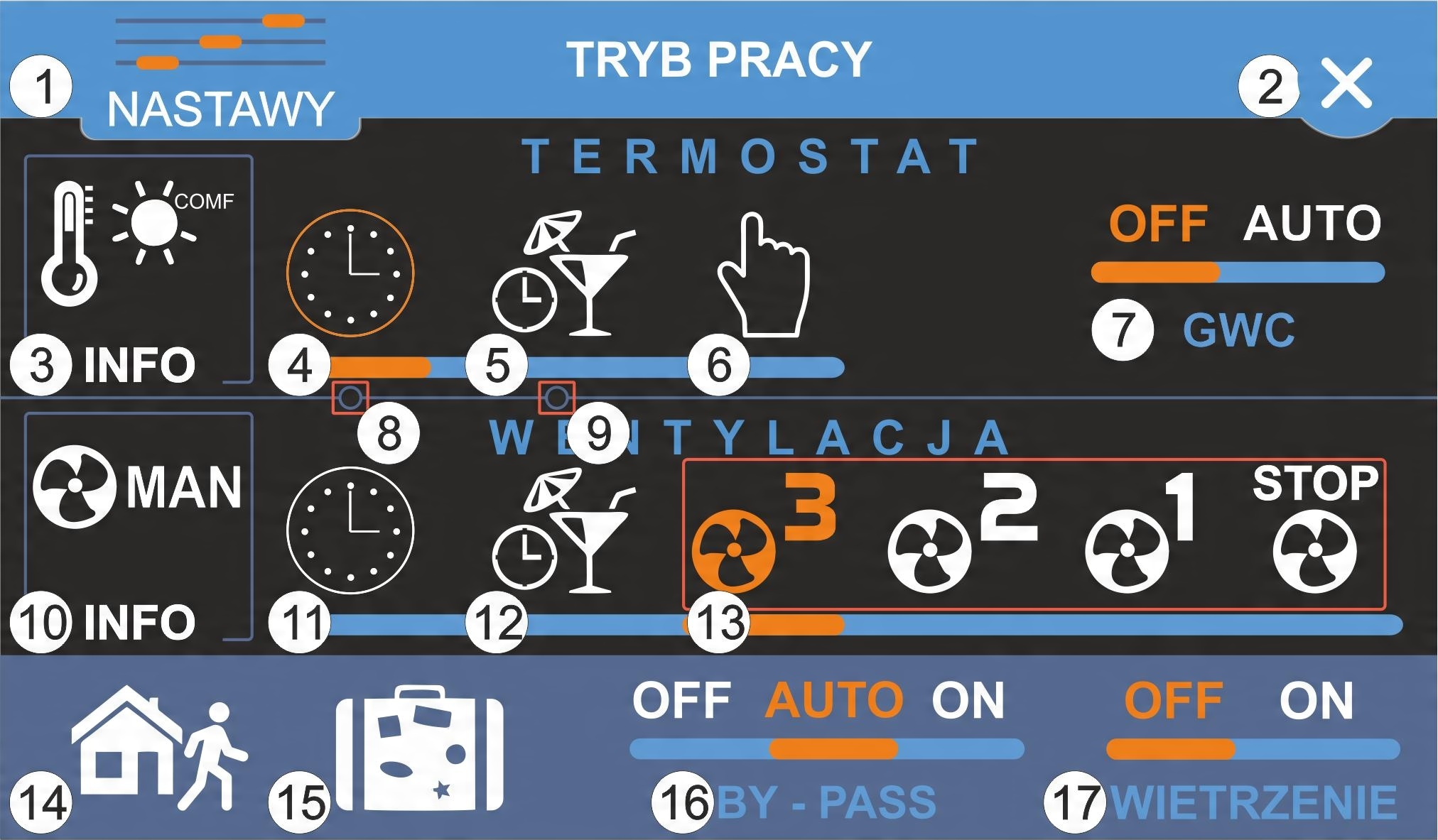 - 17: Переключает вентиляцию в режим проветривания. Опция не отображается, если включен режим ВНЕ ДОМА (NANO1) или ОТПУСК.