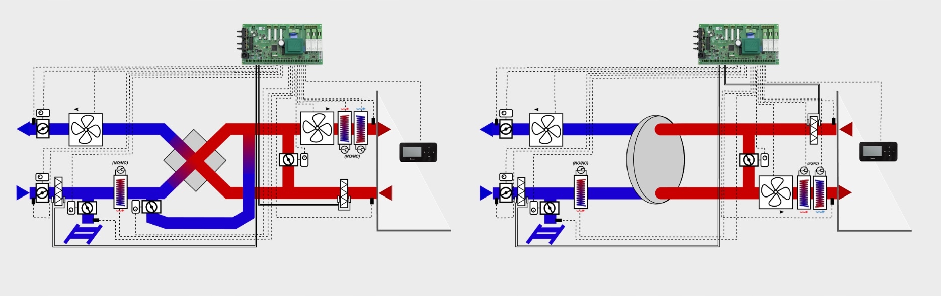 •Утилизация тепла из вентилируемых помещений путем управления рекуператором механической вентиляции с противоточным, перекрестным или ротационным теплообменником