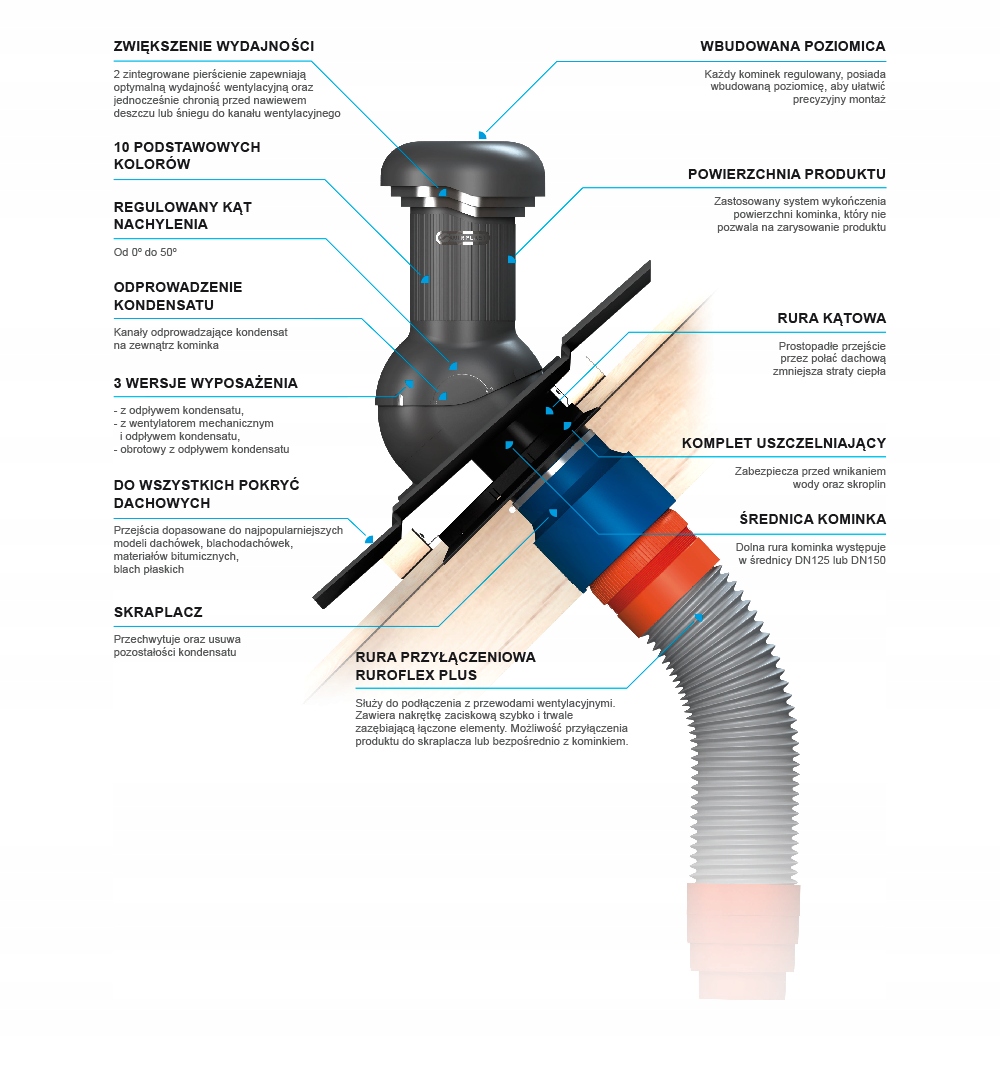 Инновационная система вентиляции WiroVent Pro отличается современной конструкцией, изготовленной из материалов высочайшего качества, обеспечивающей всестороннюю циркуляцию воздуха между закрытым помещением и внешним пространством. Инженерная форма системы позволяет отводить конденсат за пределы камина, обеспечивая оптимальную эффективность вентиляции и защиту от заноса дождя или снега в вентиляционный канал. Состав системы позволяет располагать камин вертикально в диапазоне от 0° до 50°. Входящая в комплект угловая соединительная труба позволяет камину проходить перпендикулярно через все слои крыши, обеспечивая профессиональное соединение, не требующее создания слишком большого отверстия. Модель с вентилятором выделяется среди других изделий замаскированным ротором, встроенным в камин, доступный в версиях Eco и Standard+. Система WiroVent Pro — это технологически продвинутое вентиляционное решение, разработанное для удовлетворения требований даже самых требовательных клиентов, которые ценят функциональность выше среднего и современный дизайн