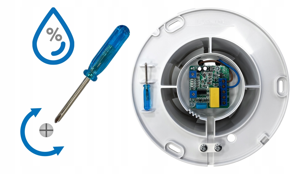 Работа с переключателем (ручной вариант) позволяет вентилятору запуститься, когда заданный уровень относительной влажности не соответствует установленному. превысило. После включения устройства выключателем оно начинает работать. При изменении положения на «выкл.» вентилятор работает в течение заданного значения задержки времени, а затем выключается.