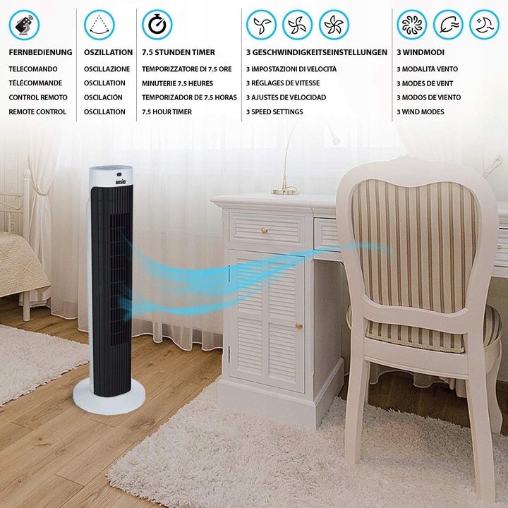 - БЕЗОПАСНОСТЬ И ПРОСТОТА В ИСПОЛЬЗОВАНИИ: башенный вентилятор оснащен удобной в использовании панелью управления с ручным управлением, установленной сверху. Большой кабель питания длиной 2 м позволяет удобно расположить вентилятор. Вентилятор оснащен высококачественным двигателем мощностью 45 Вт