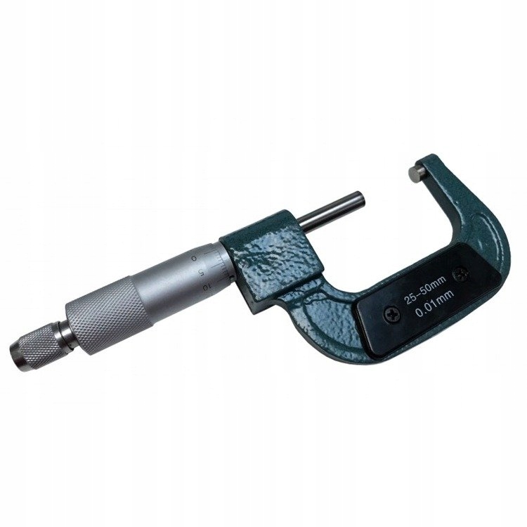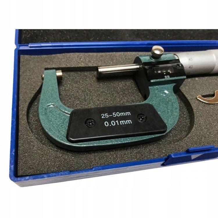 Микрометр (также называемый микрометром, в отличие от микрометра, как единицы измерения) — измерительный прибор, используемый для точных измерений. измерение. Работа прибора основана на использовании микрометрического винта и нониуса. Микрометрический винт — это очень точно изготовленный винт с шагом резьбы 1 мм, соединенный с микрометрическим барабаном со шкалой (верньером), выгравированной по его окружности. Ручка соединена с барабаном микрометра с помощью храповой муфты, обеспечивающей соответствующее постоянное давление губок. Неподходящее давление приводит к значительным погрешностям измерений. Все упаковано в практичную прочную коробку.