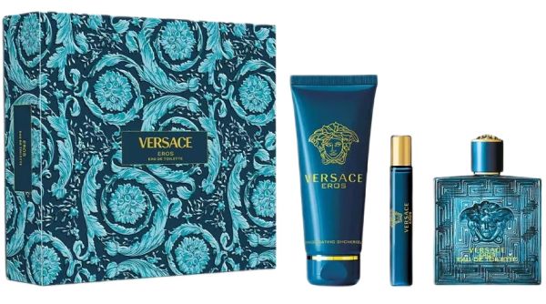 Набор ароматов Versace Eros, который включает в себя 100 мл туалетной воды, 10 мл туалетной воды и 150 мл геля для душа.