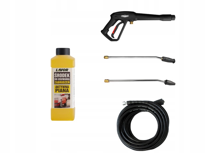Стиральная машина оснащена профессиональными аксессуарами. Латунный пистолет – для большей безопасности эксплуатации все соединения выполнены с латунной резьбой. Копье с возможностью смены потока работы. Шланг высокого давления с ДВОЙНОЙ ОПЛЕТКОЙ – благодаря такому решению он безопасен при высоком давлении и не подвержен механическим повреждениям.
