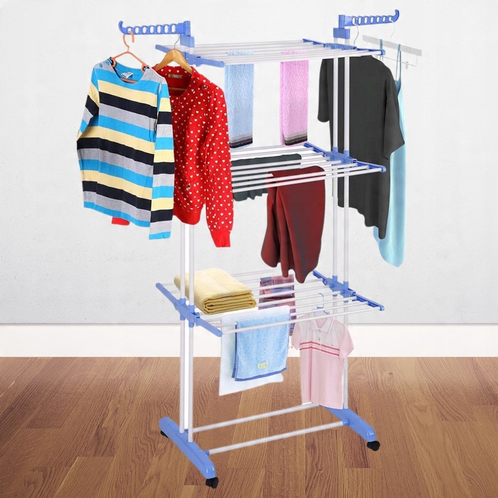 Вертикальная трехуровневая отдельно стоящая сушилка для белья. Благодаря колесам он очень мобилен, мы можем легко и быстро переместить его с одного места на другое. Кроме того, колеса имеют блокировку, поэтому мы можем быть уверены, что сушилка будет устойчивой и не сдвинется с места при порыве ветра или сквозняке.