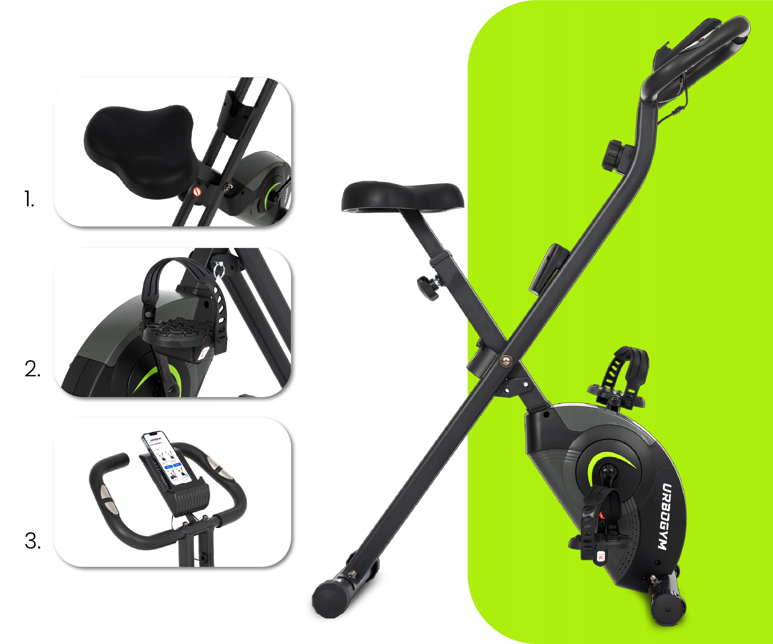 Небольшой складной велотренажер URBOGYM Alpha Skill — идеальное решение для домашних кардиотренировок. Благодаря компактному дизайну и устойчивой конструкции вы можете комфортно заниматься спортом даже в небольших помещениях. Устройство было разработано для обеспечения плавной, бесшумной работы и максимального комфорта в использовании. Складной велотренажер Alpha Skill создан для обеспечения максимального комфорта во время тренировок. Он оснащен подставкой для бутылки с водой или держателем для телефона и полкой для книги или планшета, что превращает тренировку в удовольствие. Эргономичное и удобное сиденье гарантирует правильное положение за рулем, сводя к минимуму риск возникновения дискомфорта даже во время длительных тренировок. Дополнительно устройство оснащено нескользящими самовыравнивающимися педалями с регулируемыми ремнями, что обеспечивает безопасность и комфорт тренировок для каждого пользователя.