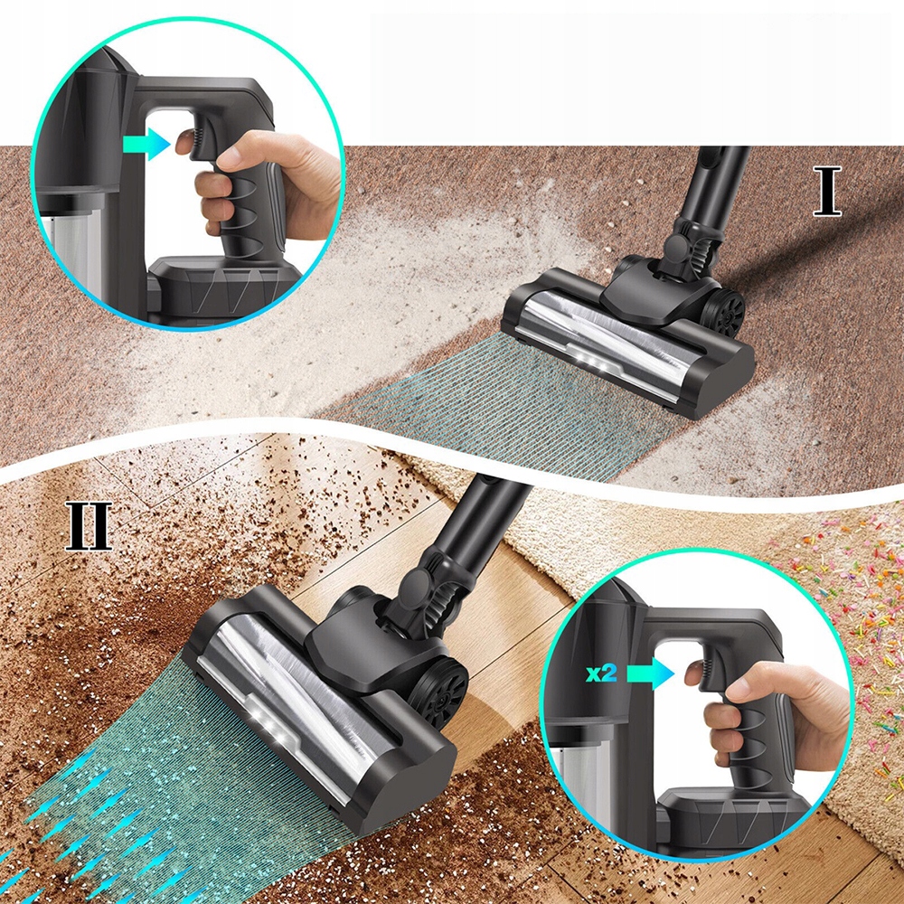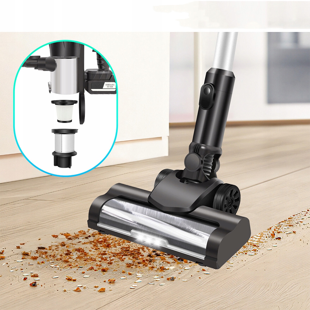 Легкий пылесос с поворотной рукояткой и ультратонкой электрической щеткой для пола со светодиодной подсветкой, которая пропылесосит каждый угол и труднодоступные места, такие как диваны и места под кроватями (поворот по горизонтали на 180° и вверх и вниз на 100°).