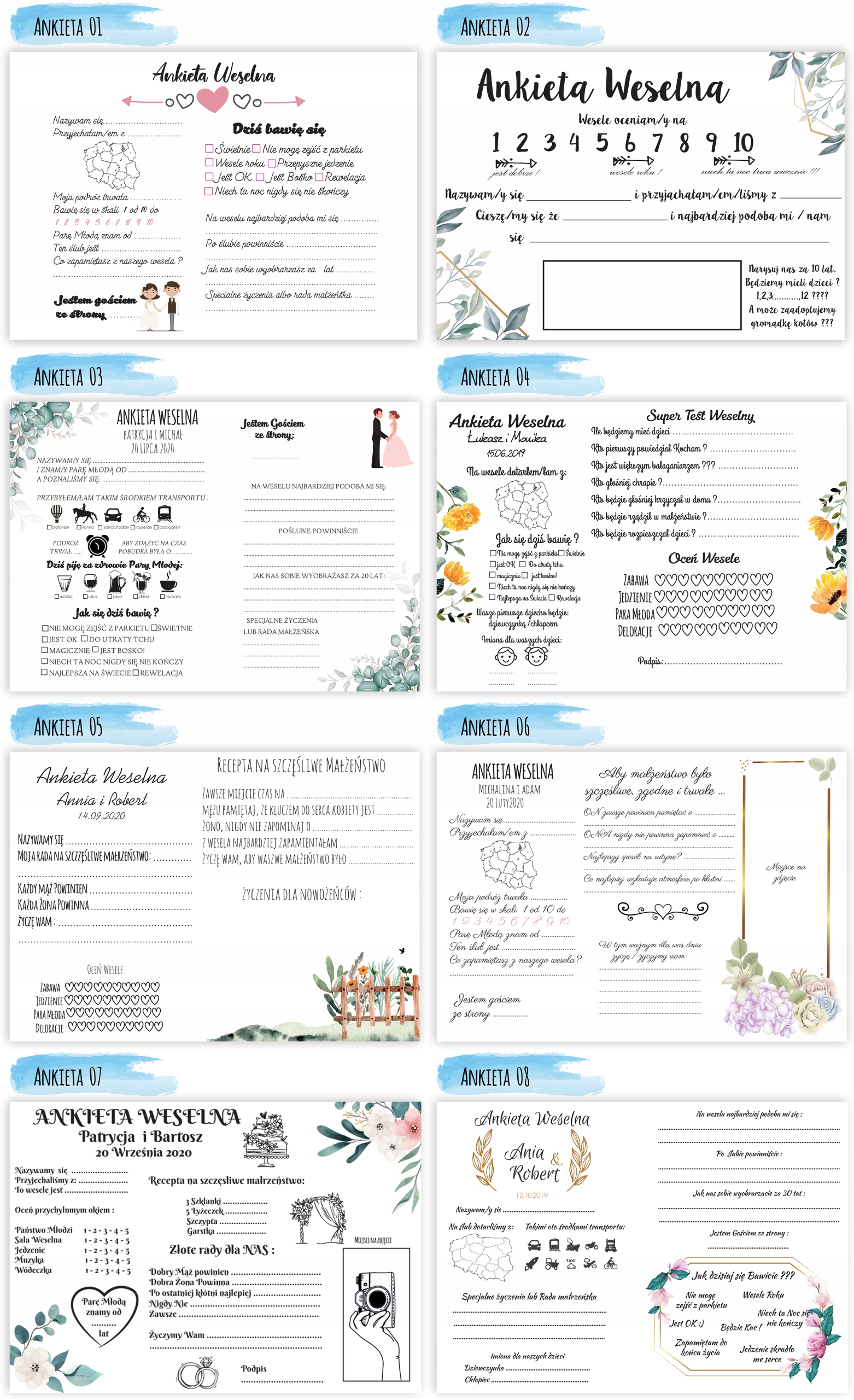 В комплект входит 30 листов бумаги с печатью на обеих сторонах, т.е. 60 опросников для заполнения. Один опрос заполняется одной парой гостей свадьбы, т.е. предложенной суммы хватит на свадьбу на 110-120 гостей при условии регистрации всех.