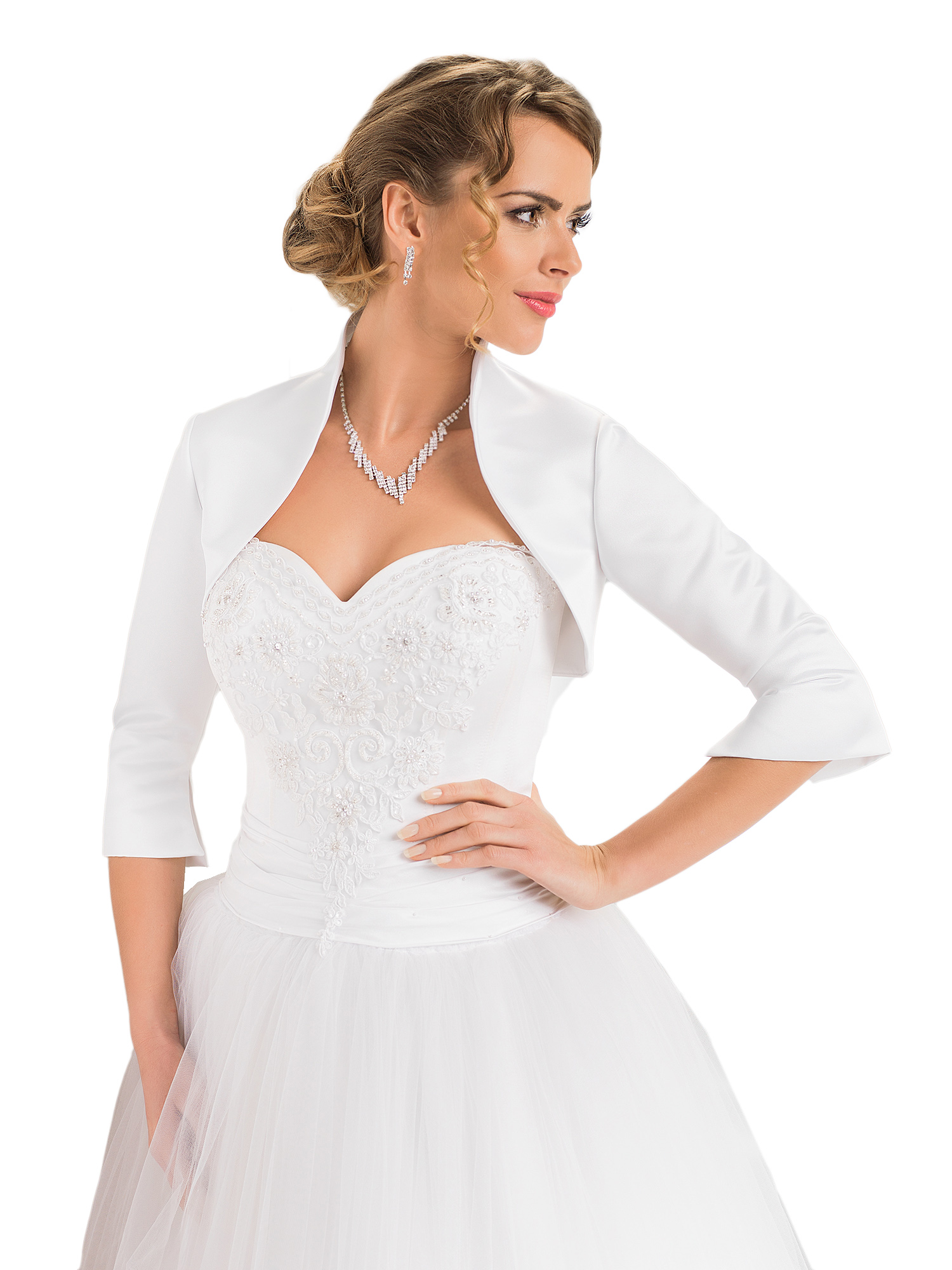 Предлагаем свадебные болеро с рукавами 3/4. Они очень тщательно изготовлены из атласа и доступны в белом, экрю или черном цвете.