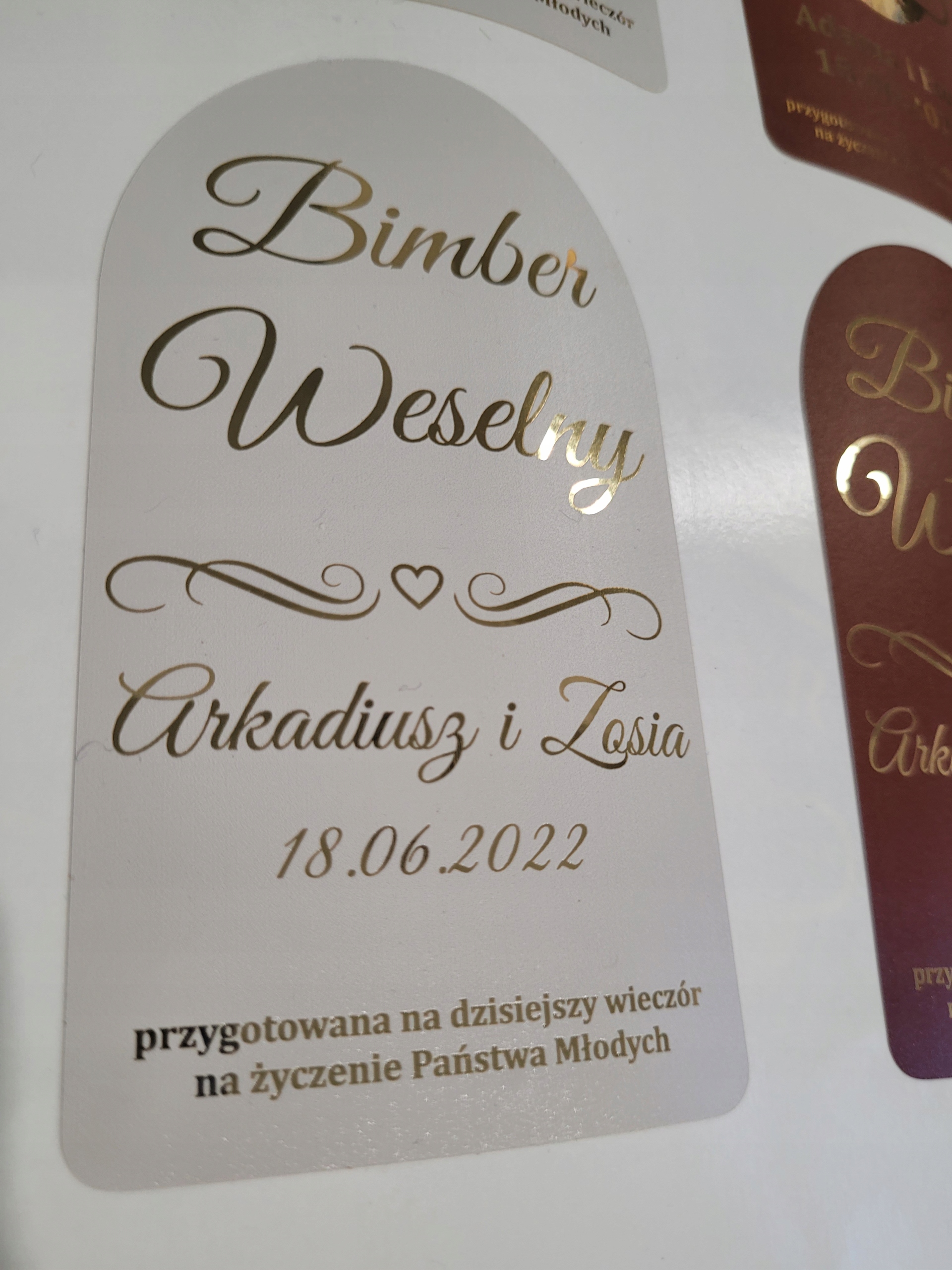 Наклейки печатаем на золотой самоклеящейся фольге с зеркальным эффектом. Он не сминается при охлаждении и не отслаивается после контакта с водой. Этикетки для свадебной водки – один из основных элементов украшения свадебного стола!