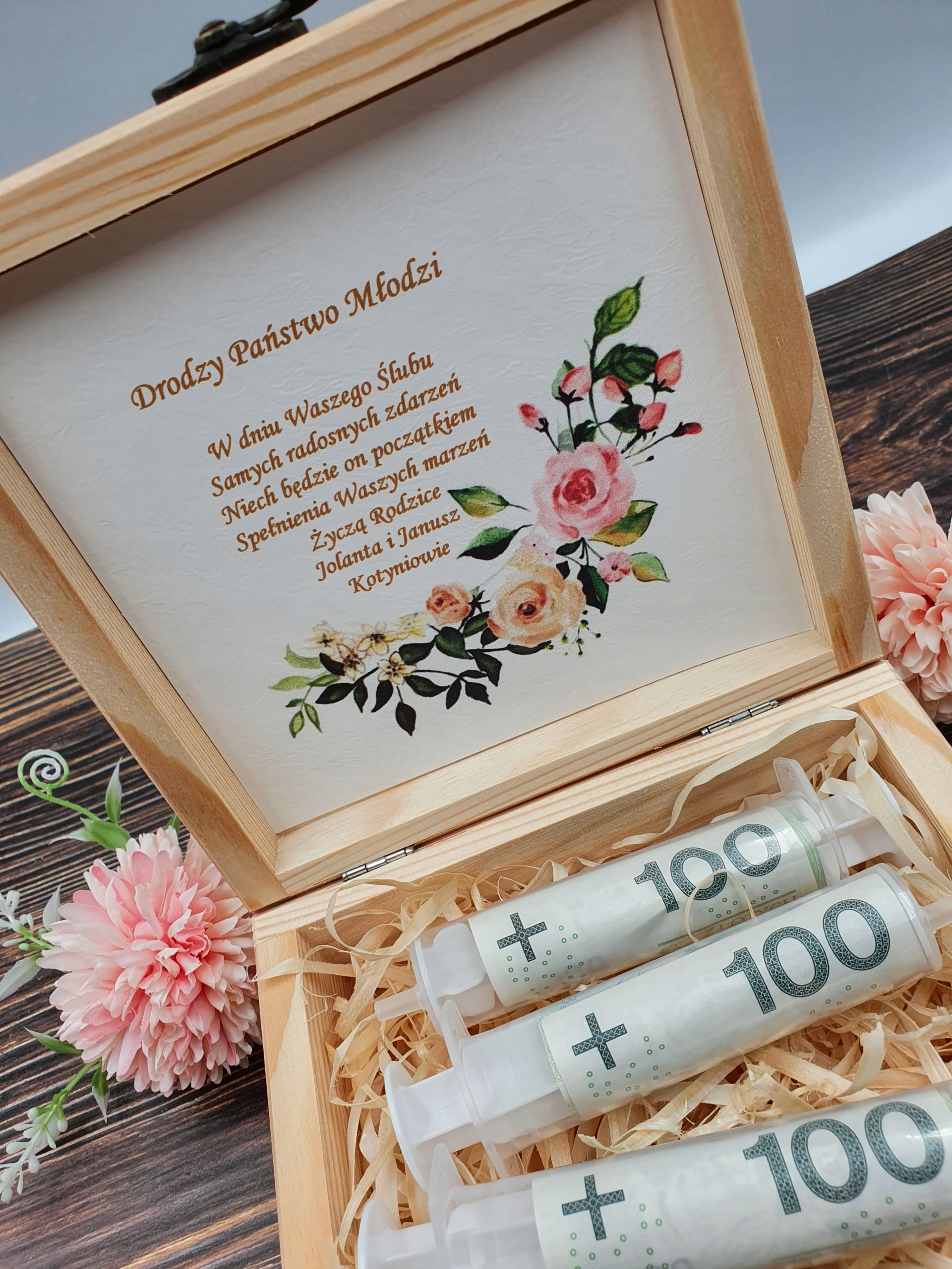 В шкатулке указаны имена жениха и невесты, а также имена людей, дарящих подарок. Вы также можете выбрать одно из большого количества свадебных пожеланий (можно отправить свое) и 12 цветочных изображений (каждое с бантом).