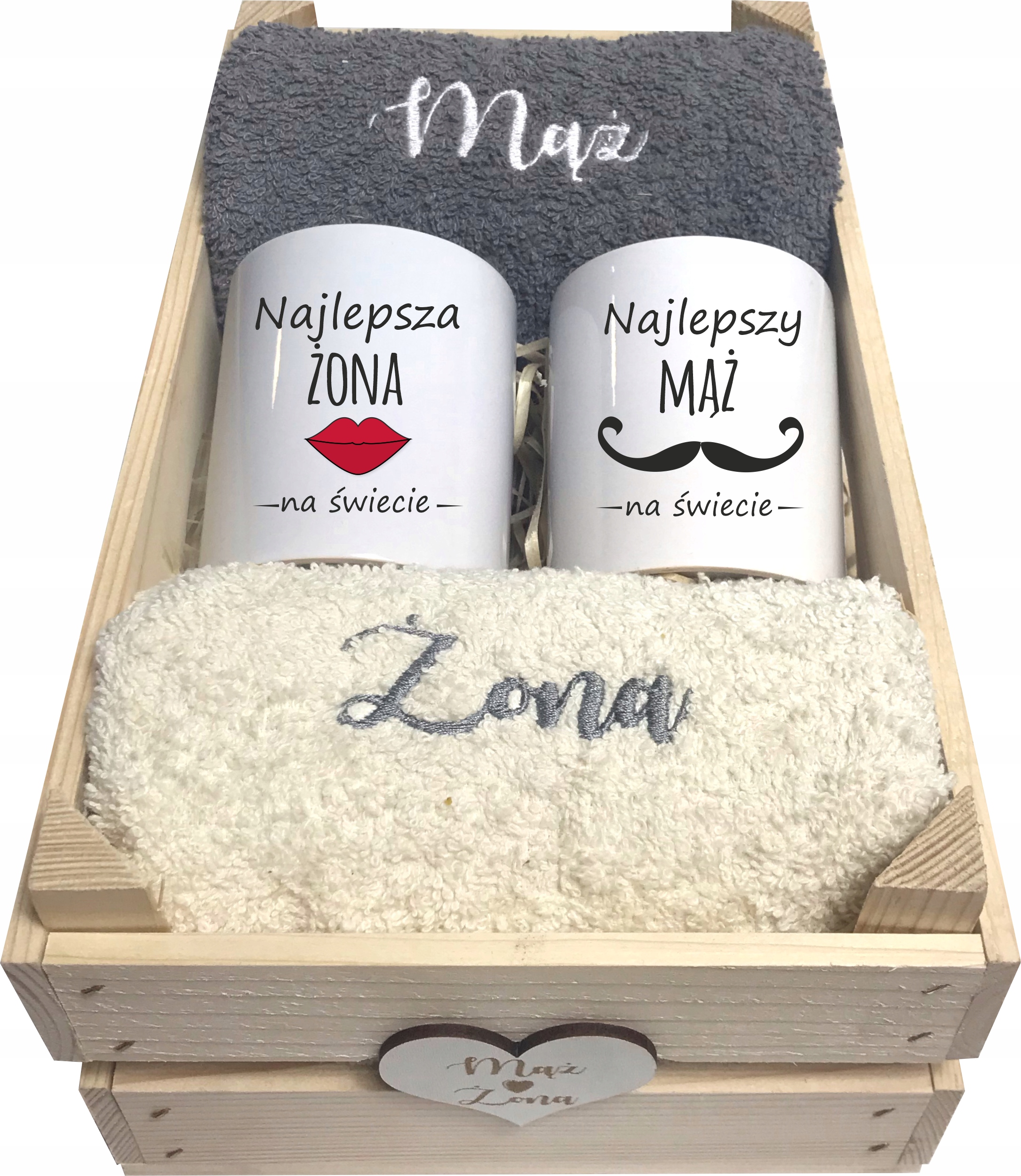 Комплект состоит из деревянной коробки с 2-мя вышитыми полотенцами и 2-мя кружками с принтом. В коробке находится древесная вата и вся вещь упакована в целлофан.