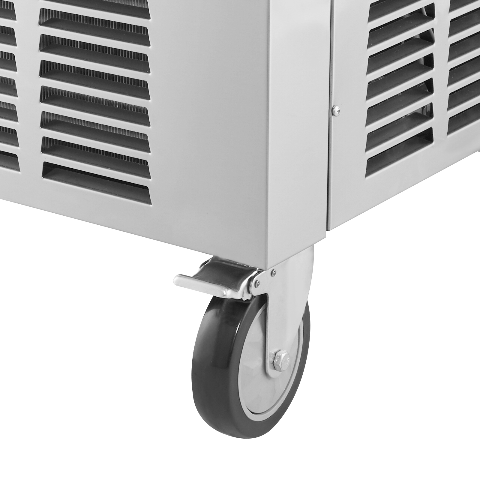 сковорода для жареного мороженого имеет 4 подвижных колеса, в том числе 2 вращающихся колеса с тормозами и 2 постоянных колеса, что позволяет перевозить его без усилий на внешние сады, рыночные киоски, торговые центры, ночные ярмарки и не только.