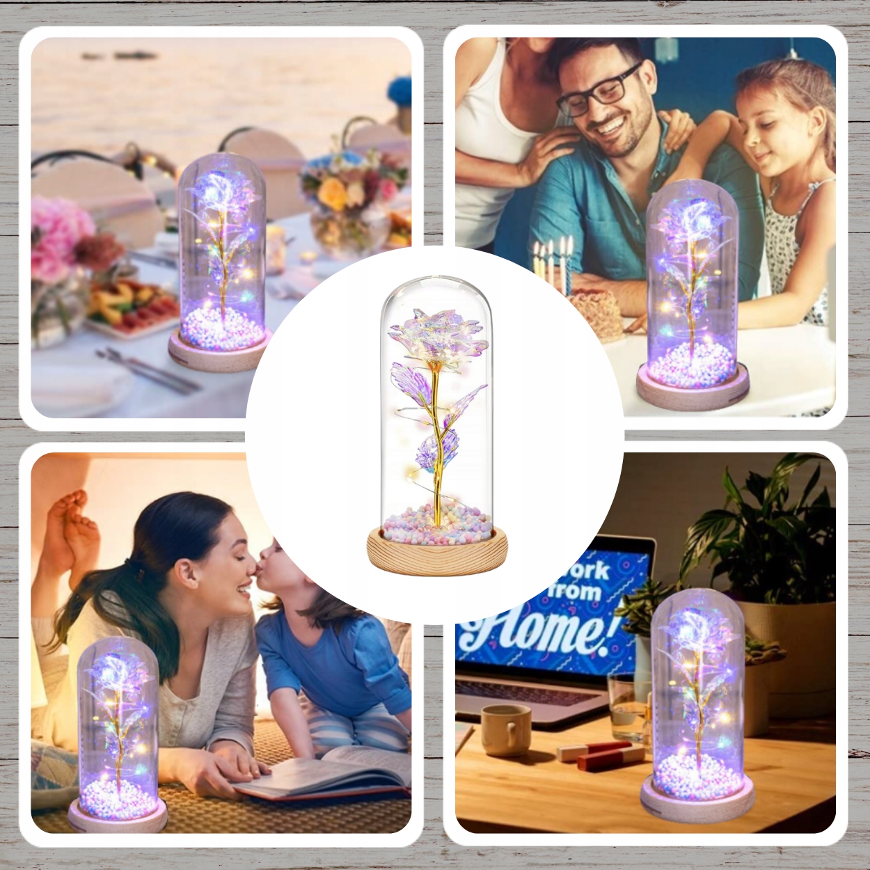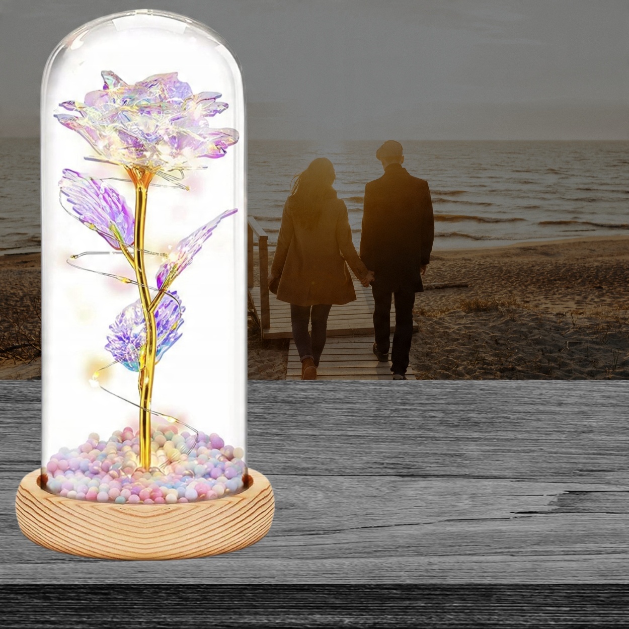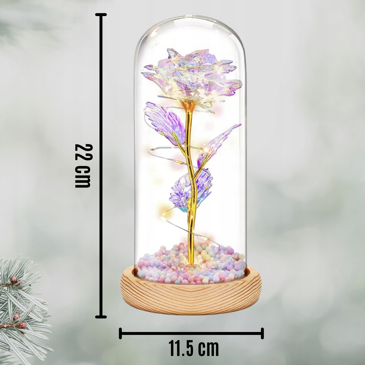 Наша вечная роза окружена светодиодными лампами, которые красиво ее освещают. Благодаря этому он выглядит чрезвычайно впечатляюще. Размещенный на прикроватной тумбочке, комоде или столе, цветок создаст волшебную атмосферу, которая напомнит вам о ваших чувствах.