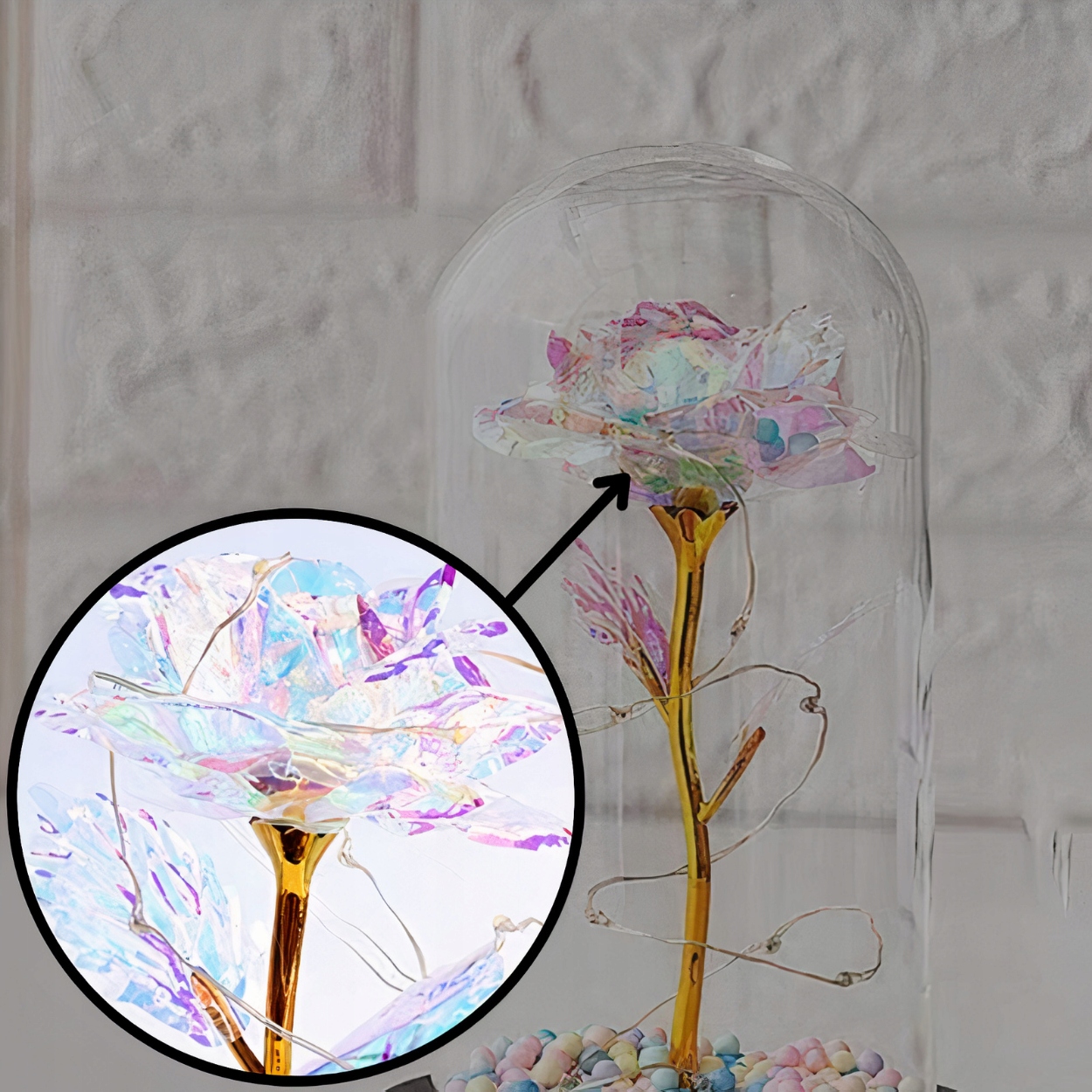 ✔ Искусственные лепестки роз выглядят текстурированными и равномерно окрашенными, круглое основание устойчиво, а прозрачный стеклянный купол предотвращает цветок от скопления пыли.