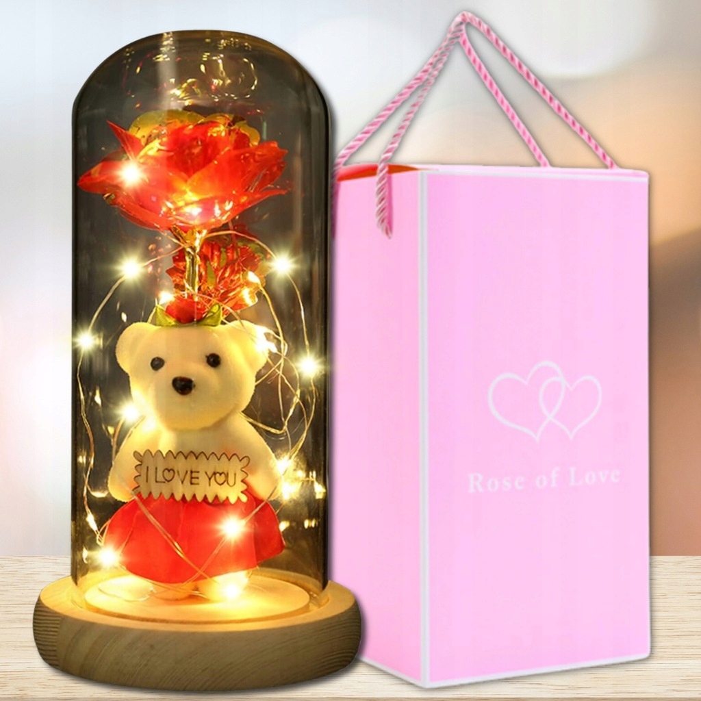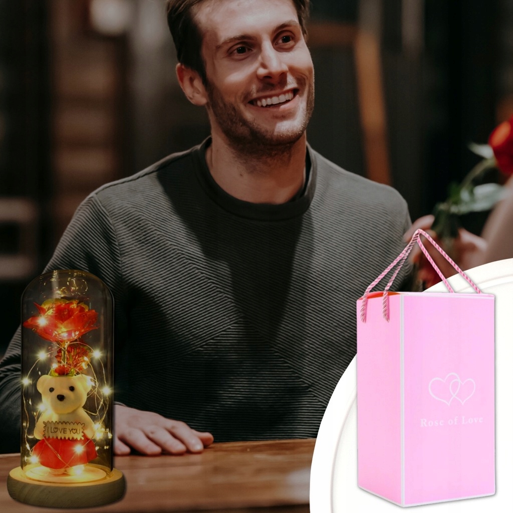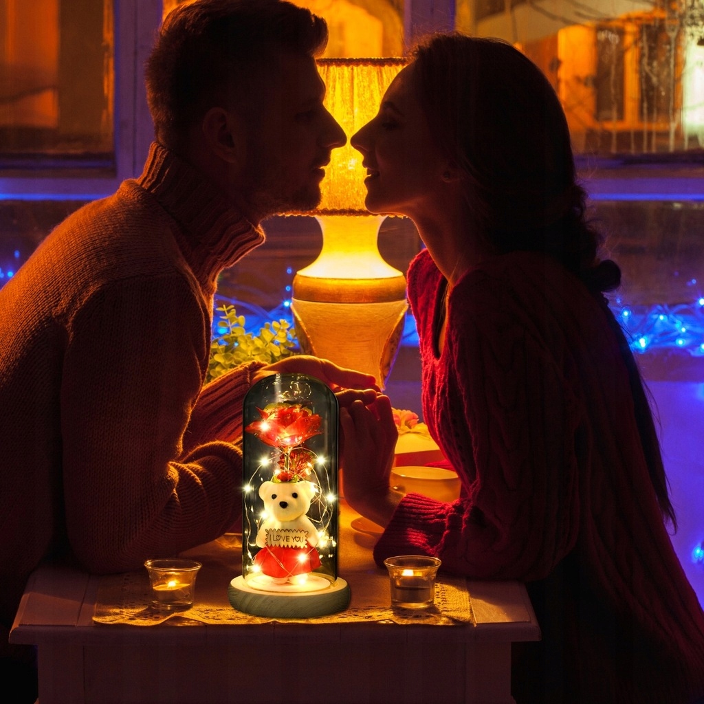 Откройте для себя набор, сочетающий в себе светодиодную розу, стеклянный купол и милого плюшевого мишку — элегантный, атмосферный и готовый подарить в красивой коробке.
