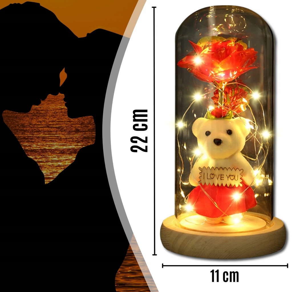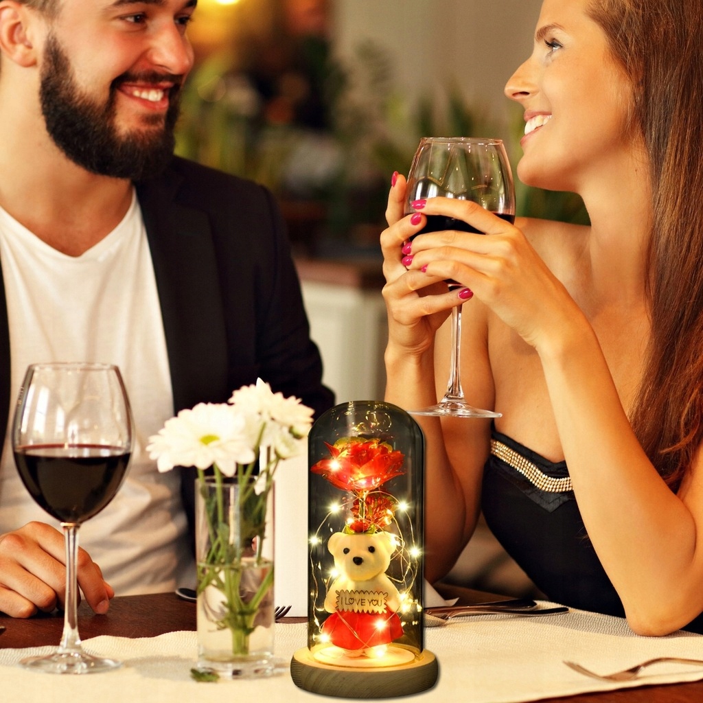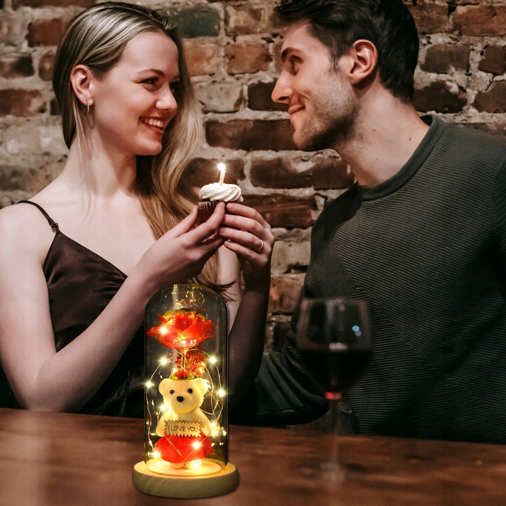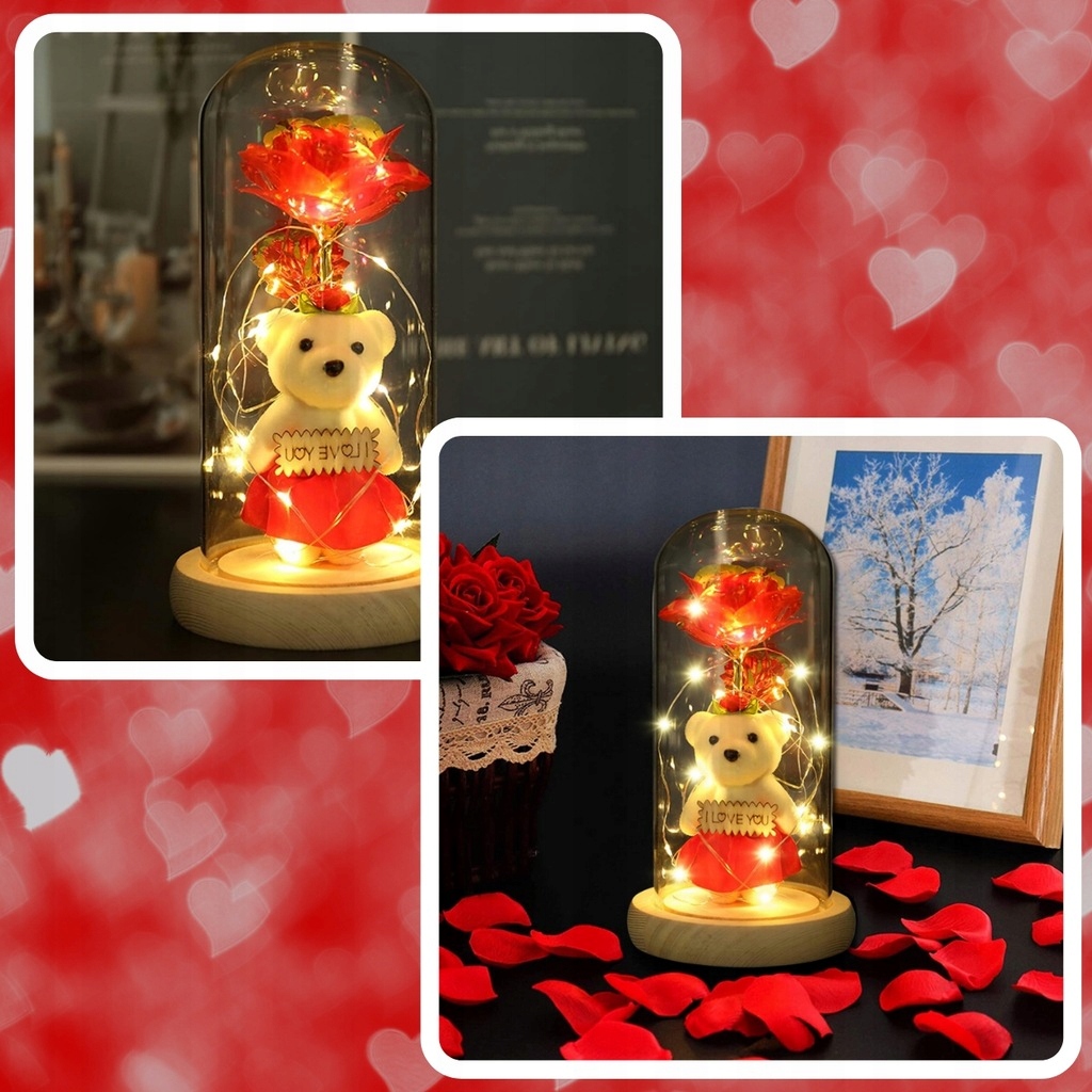 Откройте для себя набор, сочетающий в себе светодиодную розу, стеклянный купол и милого плюшевого мишку — элегантный, атмосферный и готовый подарить в красивой коробке.