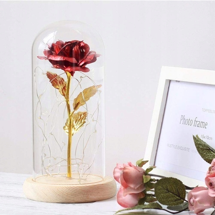 - Стеклянный купол. , деревянная подставка и роза, подсвеченная светодиодными лампами, создают идеальное целое.