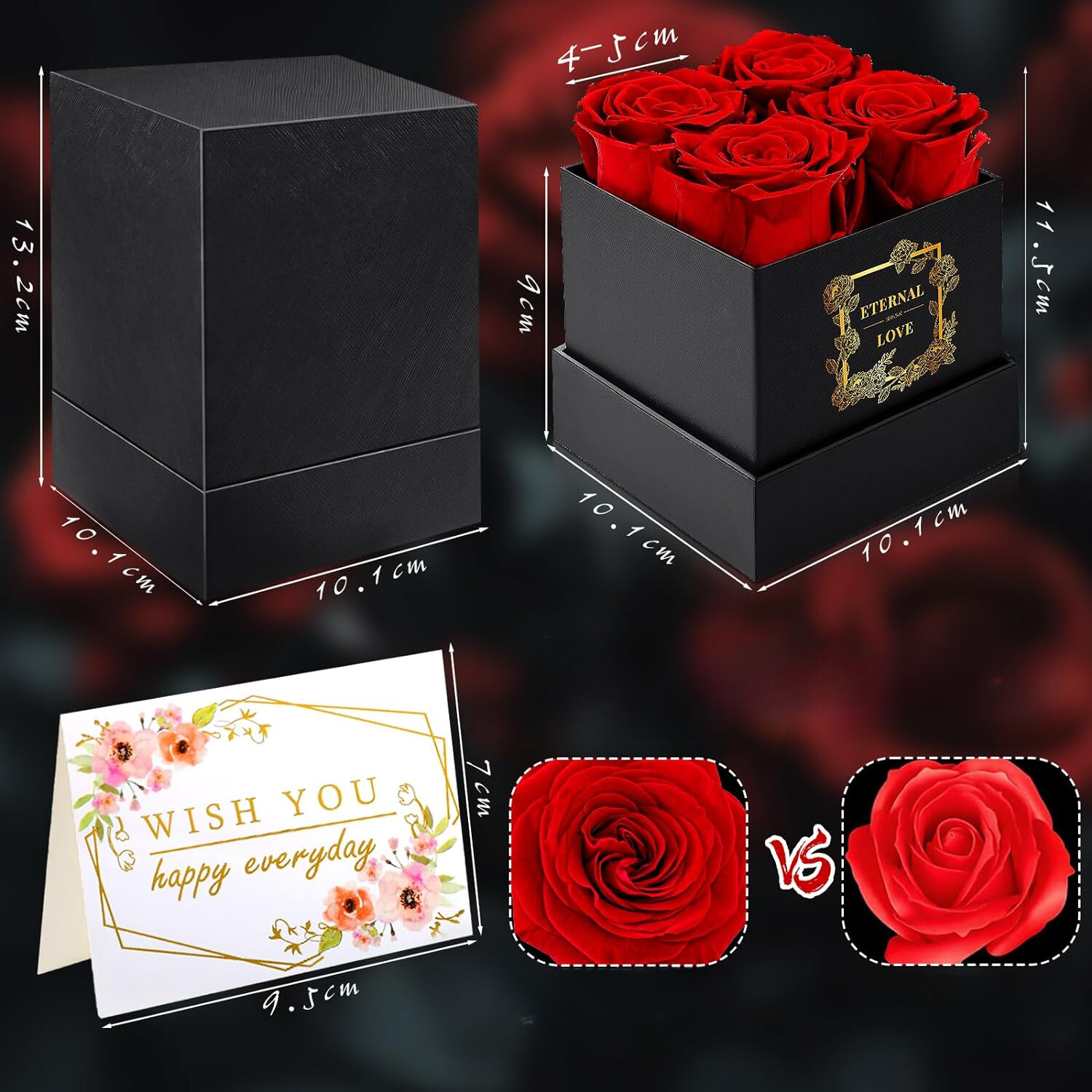 � 🌹【 Президированная роза - Сохраненная роза является символом вечной любви, 100% ручной работы из реальных цветов, обрабатываемых уникальным методом технического обслуживания. Вечный цветок выражает вашу бесконечную любовь к близким. Сохраненный вечный цветок длится 3-5 лет, будучи настоящим и естественным цветом, который не будет тюрьмой. Все 4 вечных роза имеют диаметр 4-5 см. Каждая коробка тщательно спроектирована, с элегантно расположенными розами и изысканными поздравительными картами