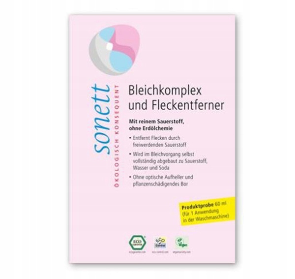 <р> Активен в стиральной машине от 50 до 95С, при замачивании от 30С. В процессе отбеливания он полностью разлагается на активный кислород, воду и соду. <р> Изделие имеет сертификаты EcoGarantie и Сертификат устойчивой экономики CSE. <р> Веганский продукт внесен в список Веганского общества. <р> Экологическая чистящая и моющая продукция бренда SONETT получила звание Лавр Эко-Потребителя 2009.Подробнее о продукте