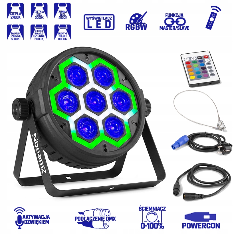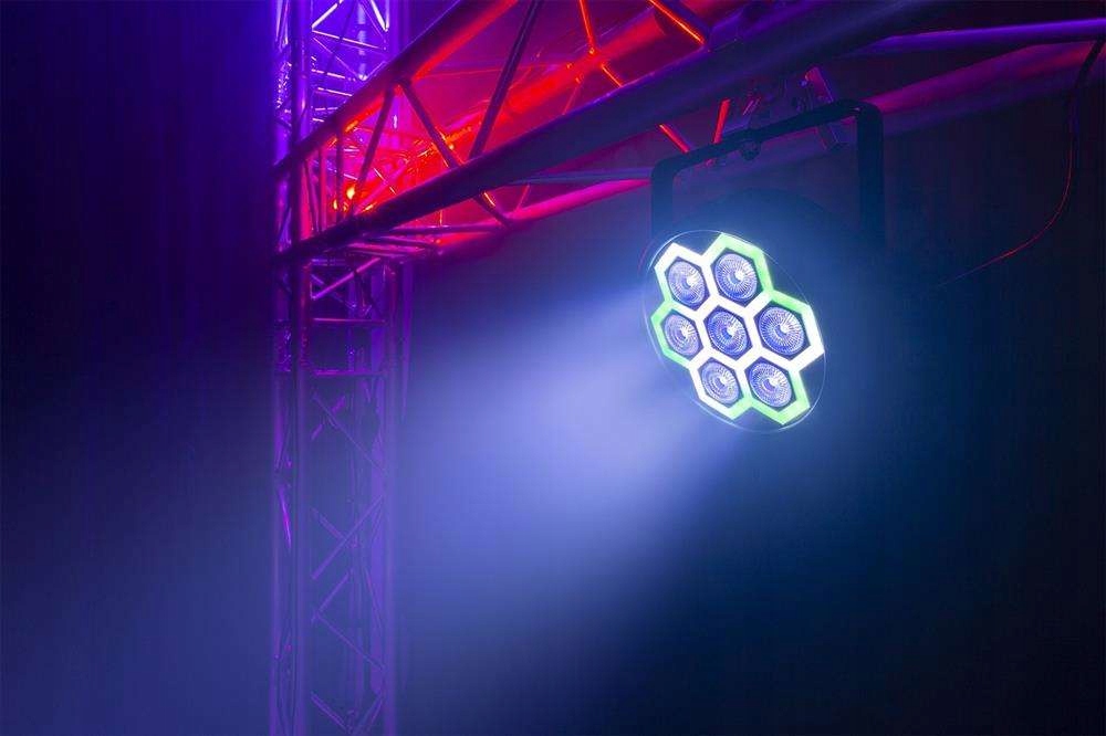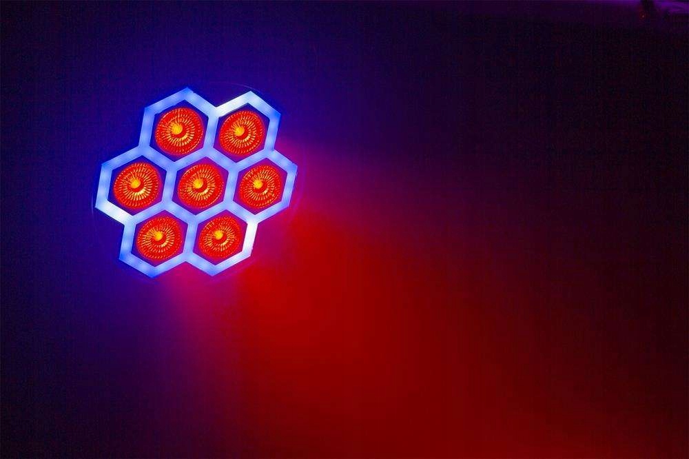 имеет 7 мощных светодиодов RGBW мощностью 10 Вт каждый. В отражателе подсвечиваются шестиугольники вокруг светодиодов. Эти шестиугольники оснащены светодиодами SMD и придают вашему световому шоу дополнительное измерение.