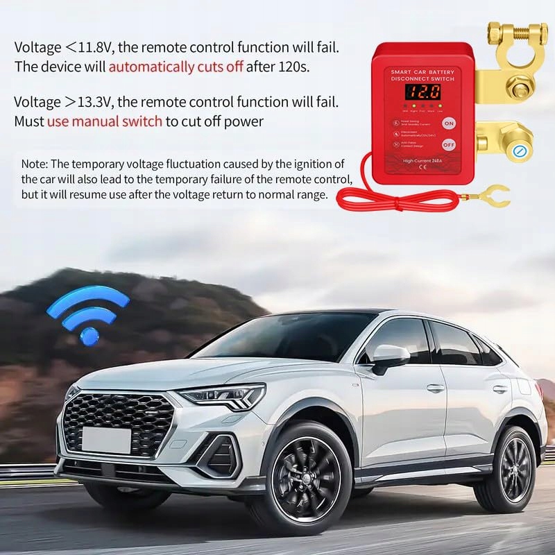 Когда напряжение батареи ниже 11,8 В, функция дистанционного управления будет сбой, а аварийный переключатель автоматически отрезает источник питания через 120 секунд для сохранения электроэнергии; Когда напряжение превышает 13,5 В, пульт дистанционного управления выключается, чтобы предотвратить случайное выключение питания во время движения, его можно контролировать только с помощью ручного переключателя.