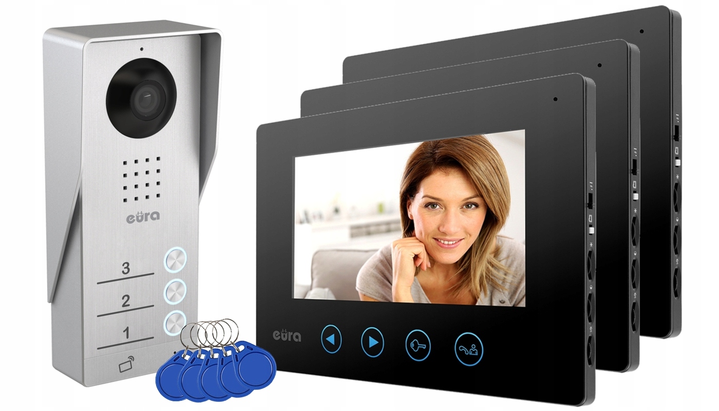 Видеодомофон на три семьи из серии Eura Connect — идеальное решение для пользователей, которым нужны устройства, контролирующие зону входа на объект. В комплект входят три черных монитора VDA-06A3, внешняя кассета VDA-93A3 и четыре сетевых адаптера постоянного тока 12В — VZA-63A3. Помимо стандартных функций — общения с посетителем, просмотра камеры окружения и управления ригелем при входе на объект, видеодомофон позволяет управлять вторым выходом, например, воротами.