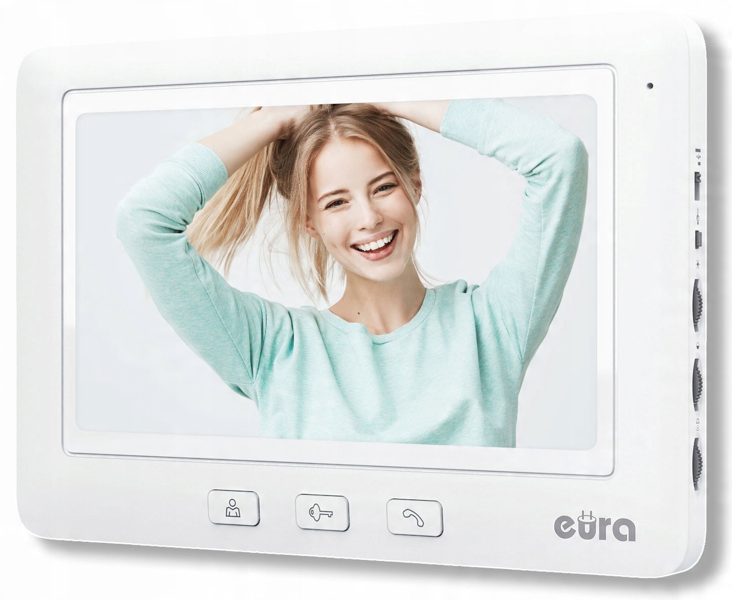 Монитор монитор с функцией громкой связи оснащен 7-дюймовой матрицей с разрешением 800х480 пикселей. Благодаря ручкам регулировки, расположенным на правой стороне корпуса, можно регулировать громкость разговора, яркость и насыщенность изображения.