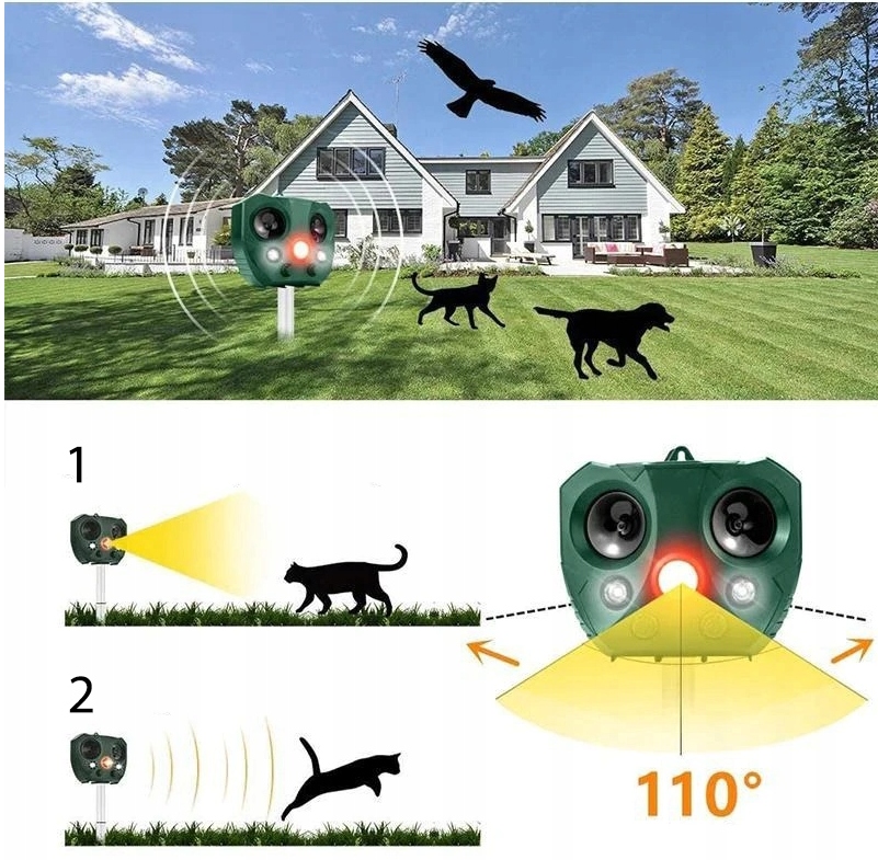 PIR-датчик запускает отпугиватель, который излучает нерегулярные и переменные ультразвуковые волны и мощное мигающее светодиодное освещение, а также подает звуковой сигнал, чтобы отпугнуть неприятных злоумышленников. Звуковые волны, генерируемые отпугивателем, работают на определенных частотах 13,5–47,5 кГц.
