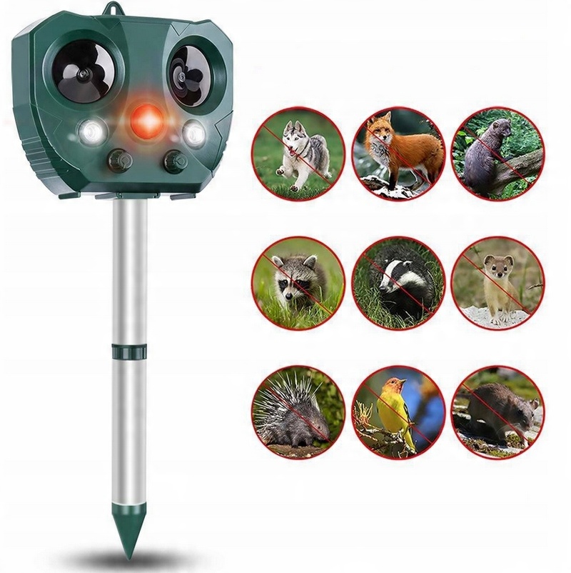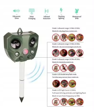 Ультразвук отпугивает животных — когда животное входит в зону, срабатывает инфракрасный датчик и изделие излучает ультразвук, чтобы животное не захотело оставаться в зоне отпугивания и убежало.