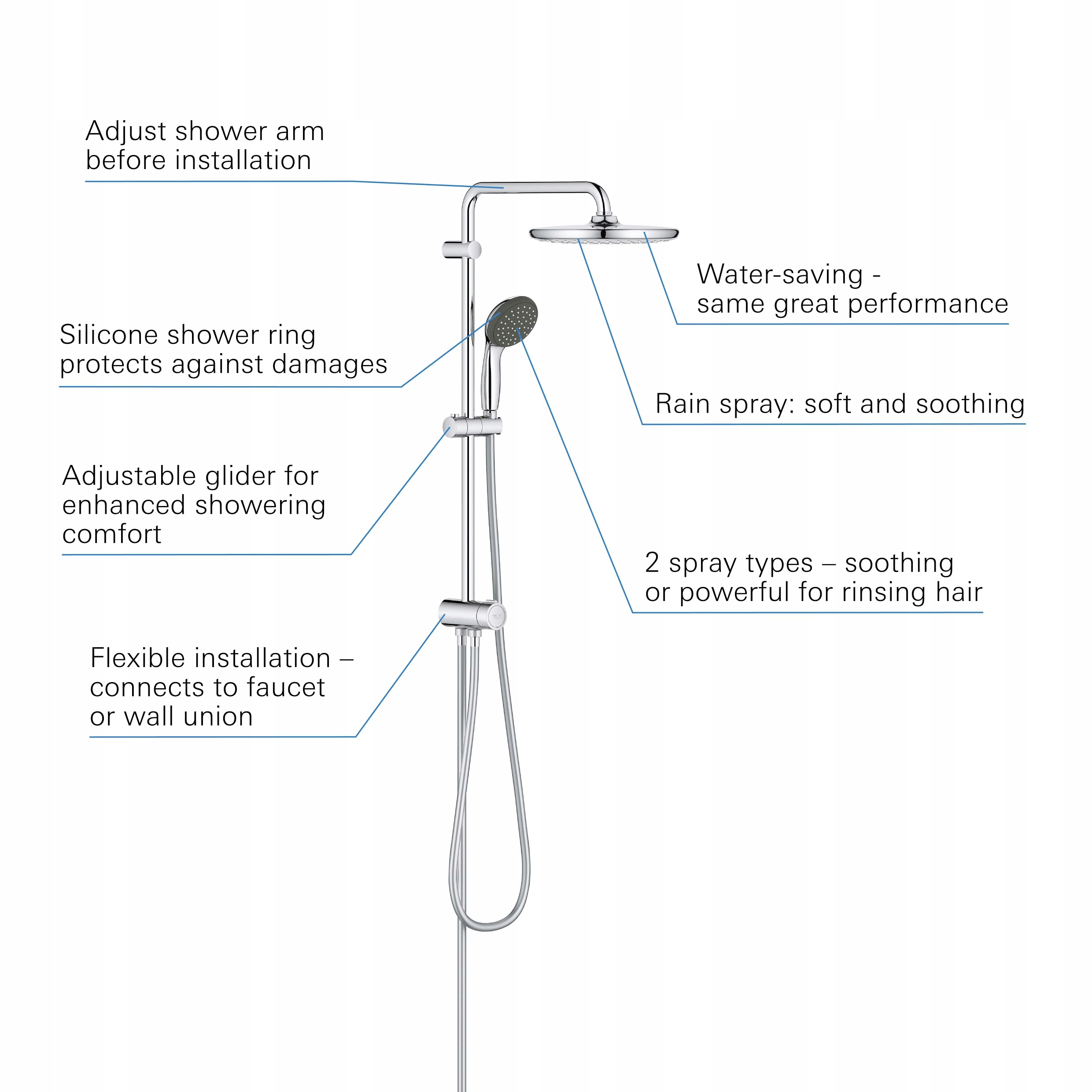 Душевая система GROHE Vitalio Start Flex — инновационное решение для вашей ванной комнаты. Благодаря использованию технологий GROHE EcoJoy и GROHE DreamSpray вы сэкономите воду и получите возможность выбрать одну из множества функций душа, чтобы начать свой день наилучшим образом. Функциональный переключатель на стене, позволяющий выбрать предпочитаемый вариант душа, обеспечит вам максимальный комфорт при использовании душа. Благодаря покрытию GROHE StarLight душевую систему легко содержать в чистоте, а ее поверхность сохраняет блеск даже после многократного использования.