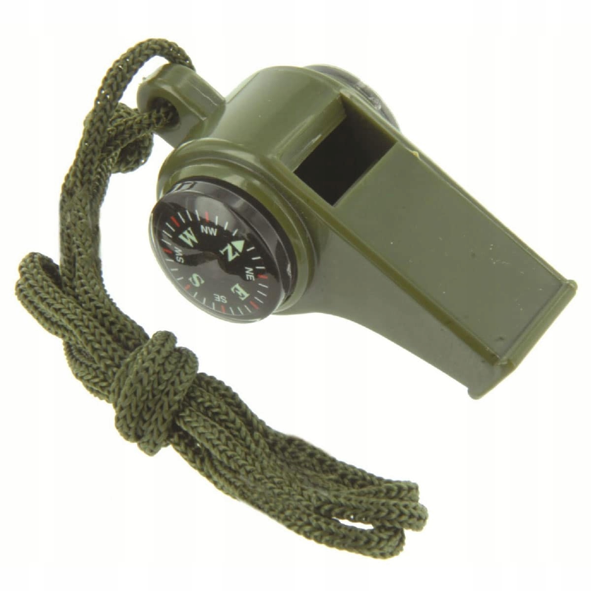 Свисток выживания из легкого и прочного пластика оливкового цвета. По бокам свистка встроен компас и термометр.