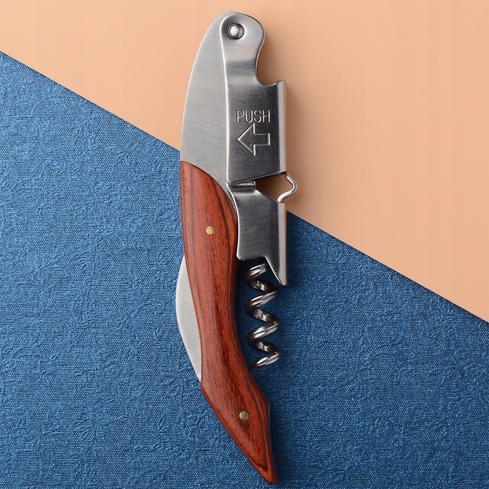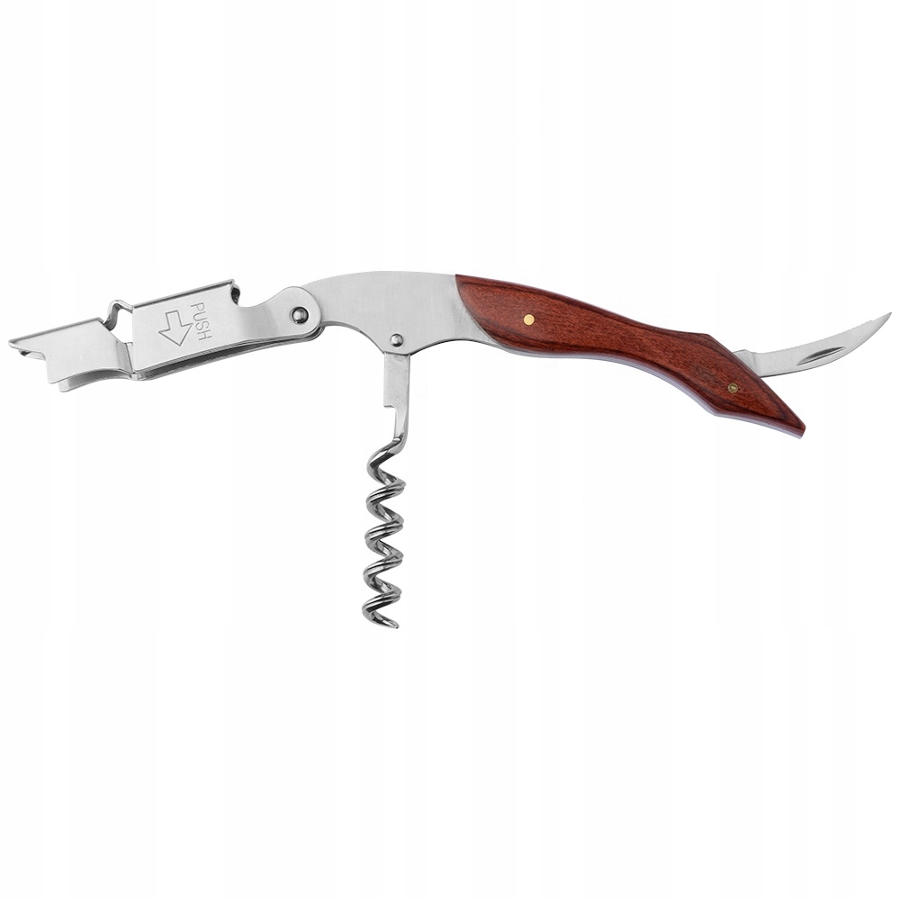 Элегантный и практичный штопор в виде перочинного ножа со встроенным ножом и открывалка для бутылок, изготовленная из высококачественной нержавеющей стали и дерева. После вкручивания винта в пробку и нажатия на элемент с надписью «нажим» достаточно двух движений рычага, чтобы вытащить пробку из бутылки.