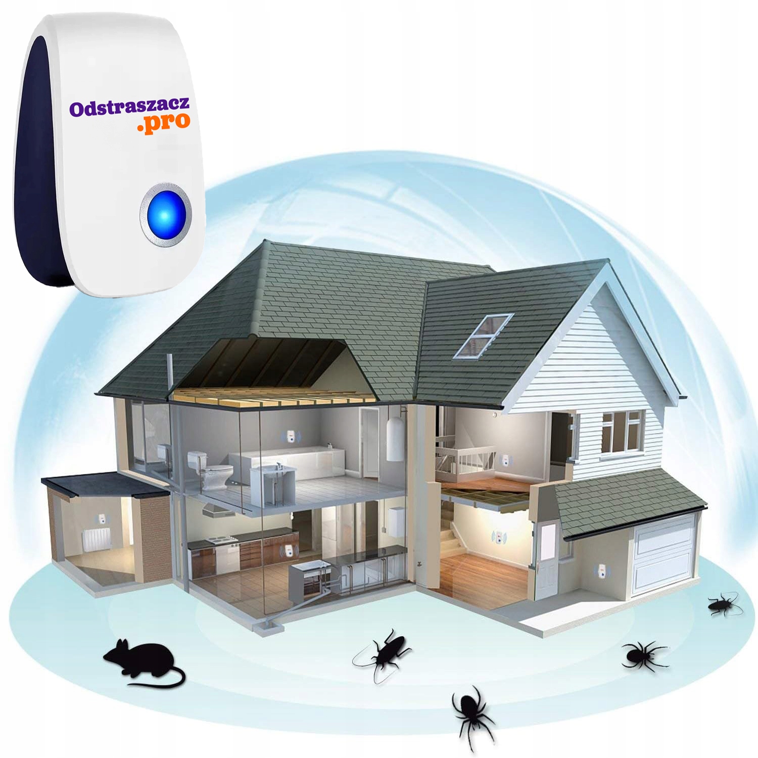 Отпугиватель мышей действует на чувствительные органы чувств грызунов, насекомых и насекомых. Сильный электромагнитный сигнал проникает через стены существующей электропроводки, создавая среду, в которой вредители чувствуют беспокойство и им трудно ориентироваться. Устройство безопасно для окружающей среды, людей и домашних животных, таких как кошки и собаки. Наличие включенного отпугивателя не вызывает никаких нарушений в работе бытовой техники.