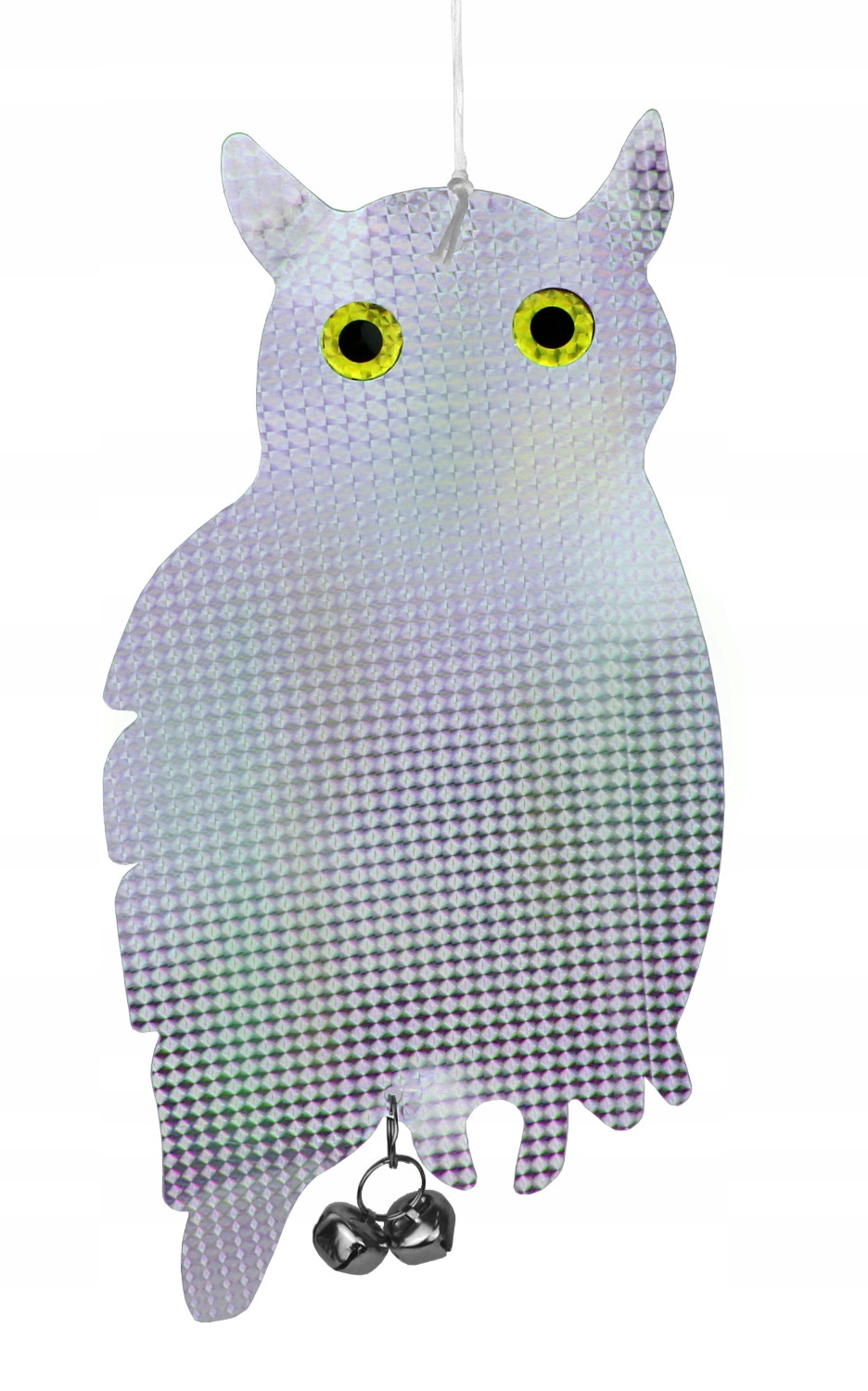 Светоотражающий двусторонний отпугиватель птиц в виде сидящей совы с колокольчиками. Эффективно отпугивает нежелательных птиц, таких как галки, воробьи, скворцы, голуби, вороны и многих других. Благодаря голографическому покрытию отпугиватель создает трехмерное впечатление. Отпугивающий эффект усиливают два колокольчика, закрепленные на нижней части совы. Изделие предназначено для подвешивания на специальной веревке в верхней части. Идеально подходит для защиты домов, балконов, садов и посевов.