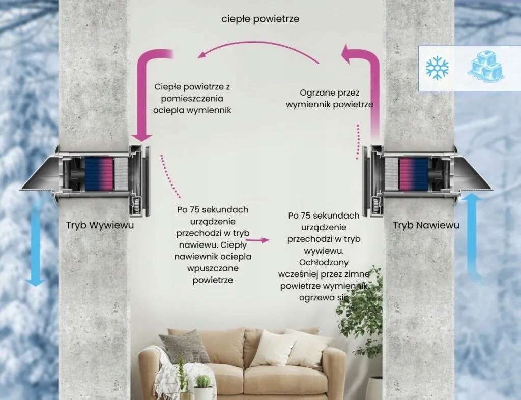 Устройство должно быть установлено во внешней стене комнаты. Одно из таких устройств достаточно для комнаты до 70 м3. Для больших комнат мы можем подключить два единицы для двух -временной эффективности вентиляции. (количество установленных устройств лучше всего проконсультироваться со специалистом или нашим советником.)