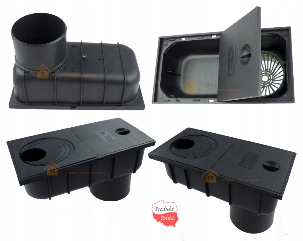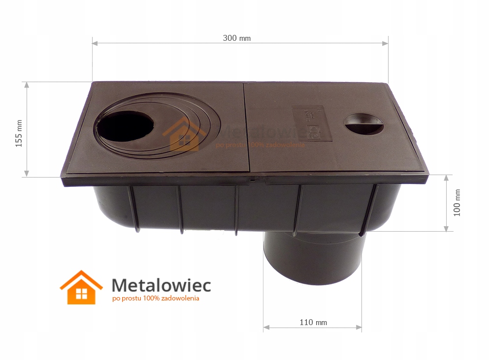 Крышка желоба имеет выемки для вырезания водосточных труб диаметром 50; фи 80; фи 90;фи 100; диаметр 110мм. Полная крышка позволяет осуществлять осмотр и очистку от грязи. Тело желобного колодца имеет вертикальный слив для канализационных труб диаметром 110 мм.
