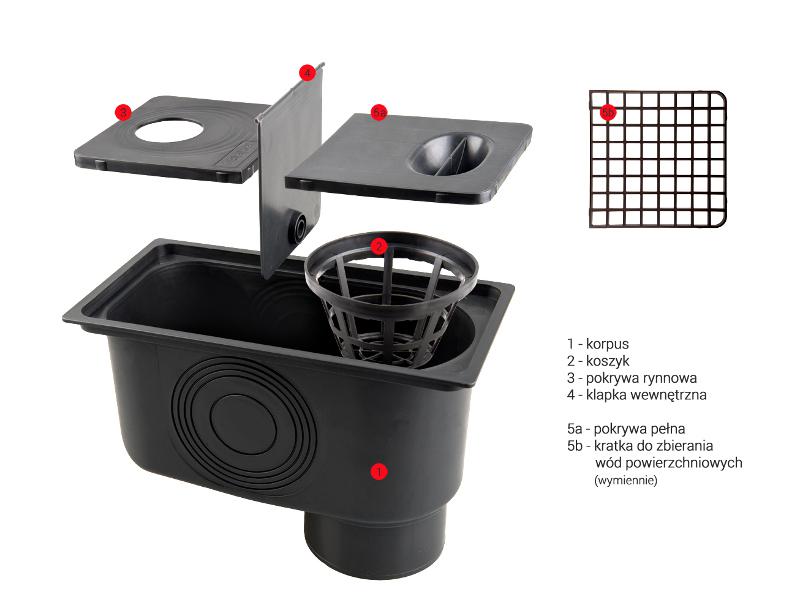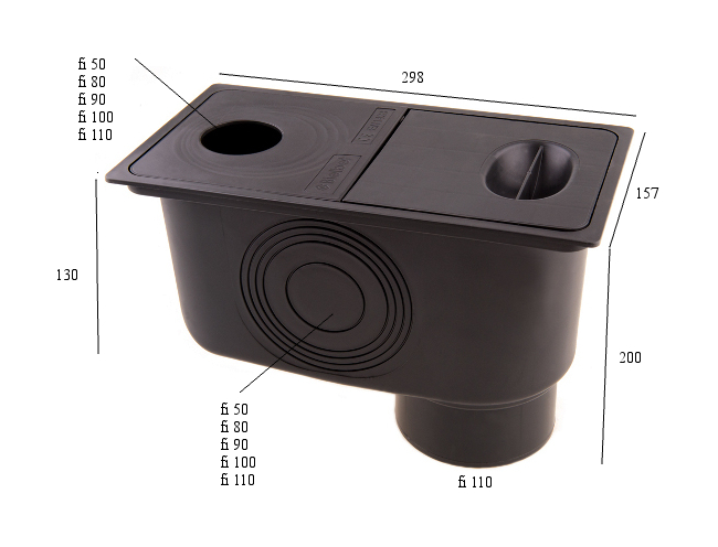 Тело желобного колодца имеет вертикальный выход для канализационных труб диаметром 110 мм. На боковых стенках корпуса имеются дополнительные тиснения для канализационных труб диаметром 50; Ø 80; Ø 90; Ø 100; Ø 110 мм, который при необходимости можно вырезать и подключить к боковому сливу.