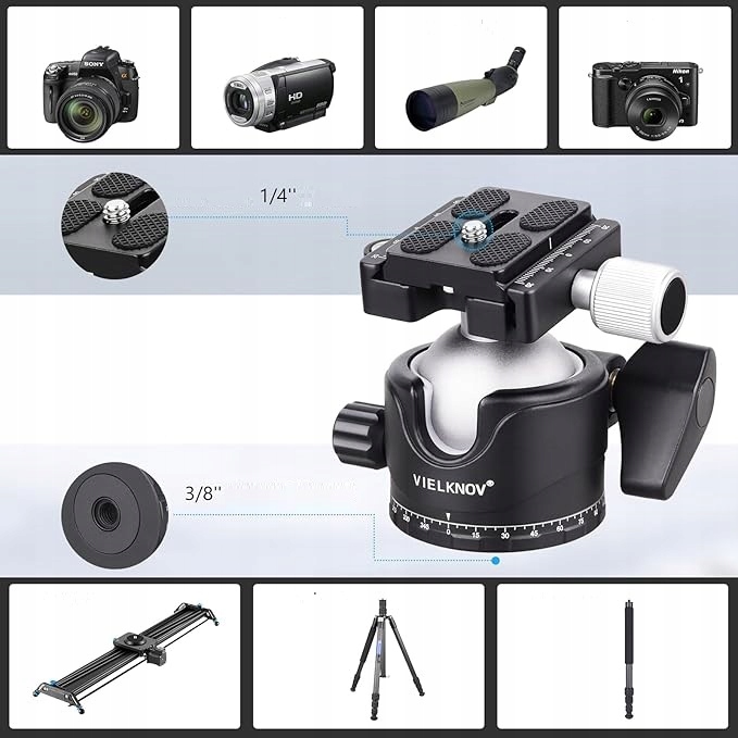 - 【Широкая совместимость】Шаровую головку можно использовать со штативами, моноподами, слайдерами для крепления камер, DV-камерами, мобильными телефонами и телескопами. Винт 1/4 дюйма для быстросъемных винтов и резьба 3/8 дюйма для винтов крепления штатива. Быстросъемные пластины совместимы с Acra RR и т. д.