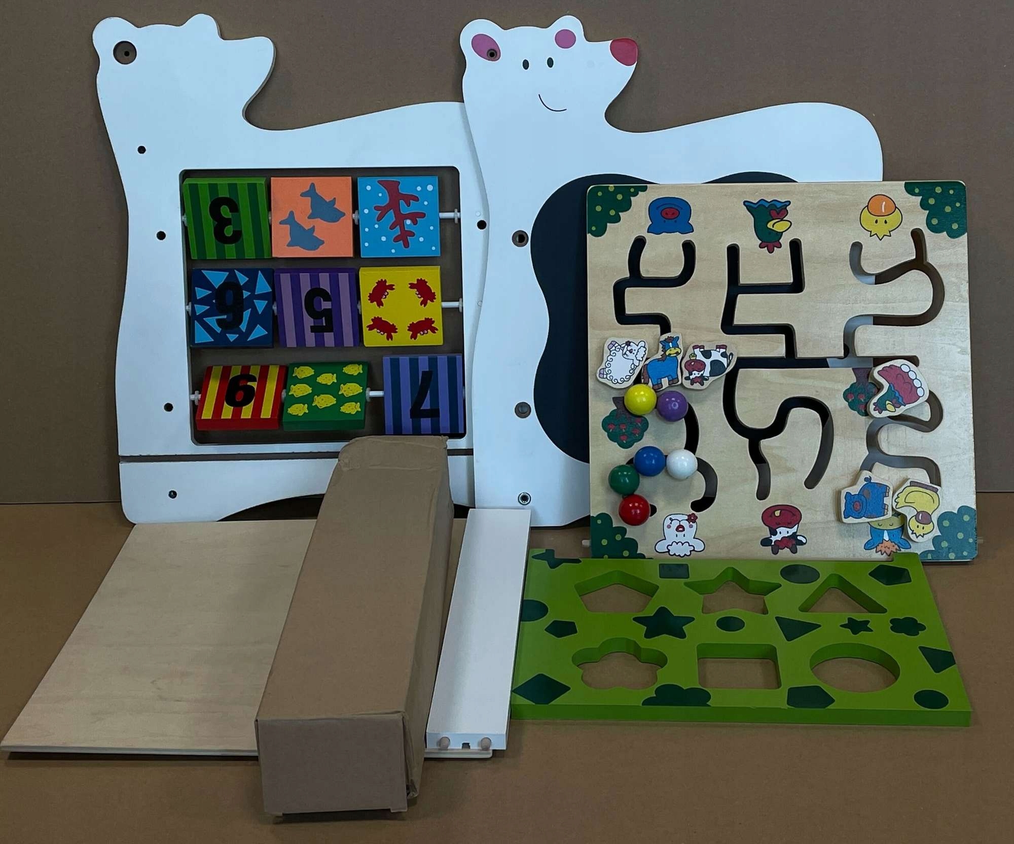 Ходунки выполнены в форме улыбающегося белого плюшевого мишки и имеют множество разноцветных, образовательные элементы. Он был полностью изготовлен из высококачественной экологической древесины. На колесиках есть резина, которая не скользит и не царапает пол. Он оснащен различными играми для детей: