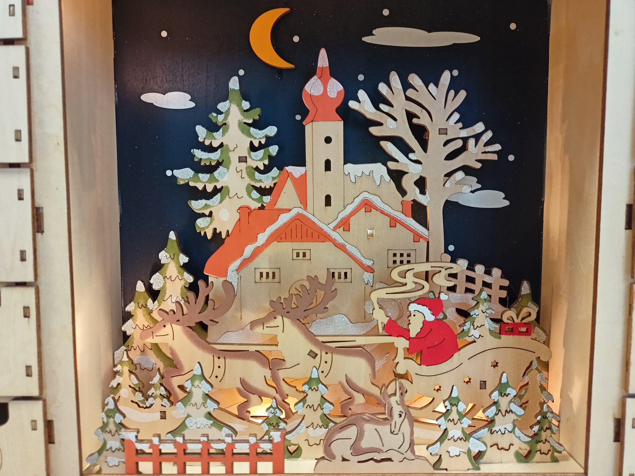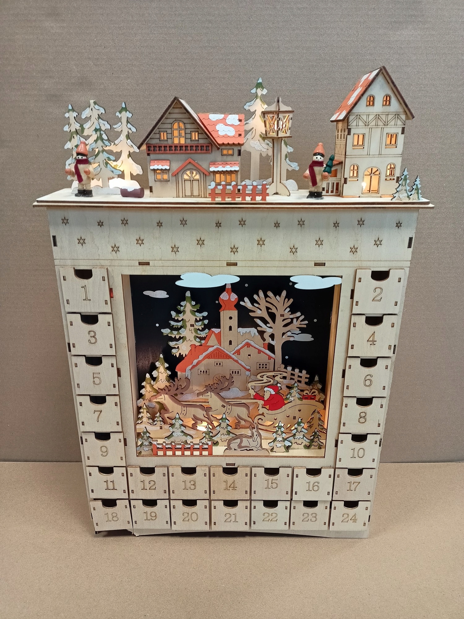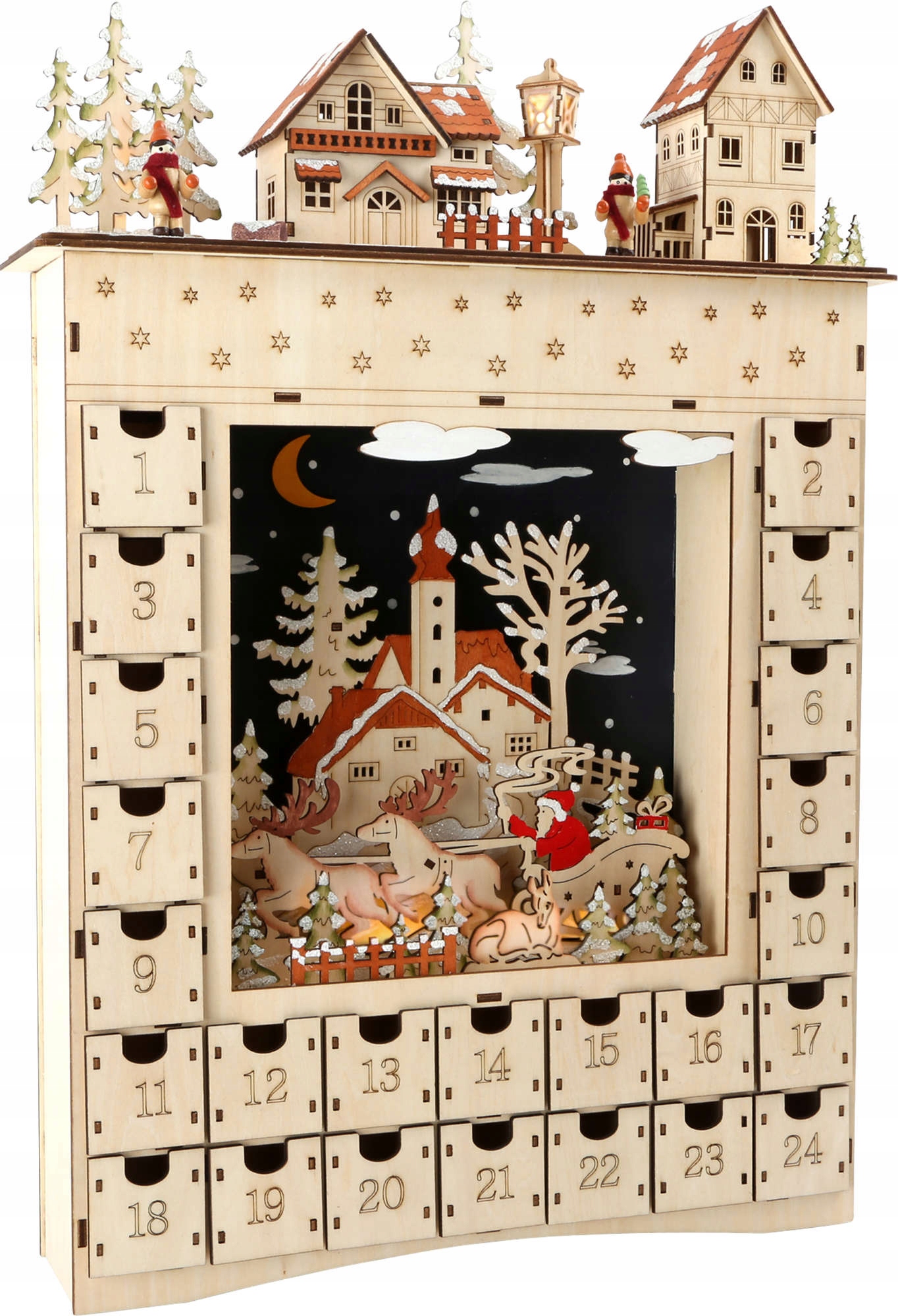 Этот уникальный адвент-календарь станет отличным украшением и аксессуаром в преддверии Рождества. Фонарь и домик, являющиеся украшениями календаря, оснащены светодиодными светильниками на батарейках, что еще больше подчеркивает красивые резные украшения. Адвент-подарки можно спрятать в деревянных ящиках с цифрами. Весь комплект выполнен из дерева.