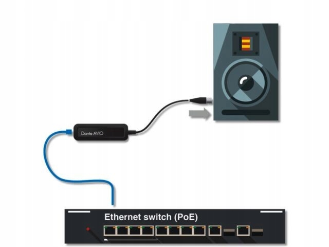 - Для подключения аналоговых аудиоустройств (например, активного громкоговорителя) к аудиосети Dante®.